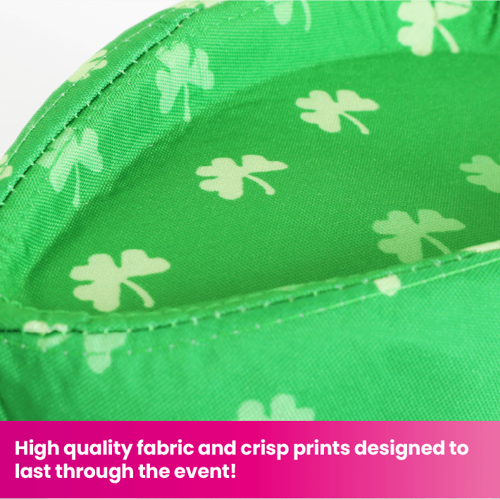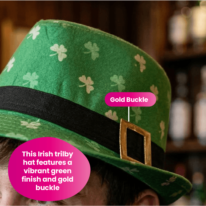 TRILBY HAT DETAILS: This Adults Irish Trilby Hat is a Green Trilby Hat covered in Shamrock print with a Black band and statement Gold Buckle, to finish off your outfit perfectly!