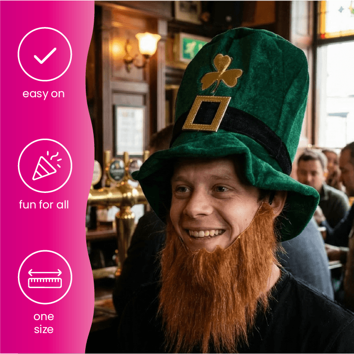 IRISH LEPRECHAUN HAT WITH BEARD: You won’t need a Pot of Gold to look the best for St Patrick's Day, so don’t miss out on picking up our Irish Leprechaun Top Hat with Ginger Beard, your perfect accessory for any Irish occasion or event!