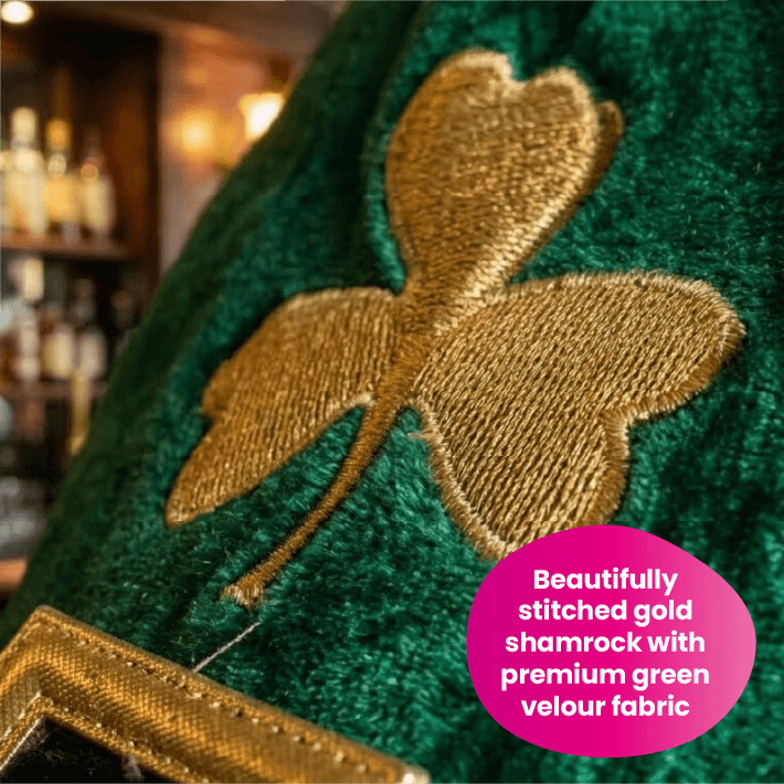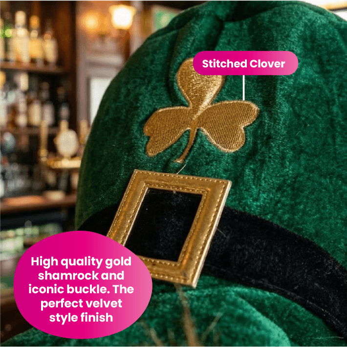 LEPRECHAUN HAT DETAILS: Your Irish Leprechaun Hat is a dark green, soft, velour Top Hat with a Gold Shamrock detail embroidered on the front, a Gold Buckle band and an attached Ginger Beard, a great addition to your Irish outfit!