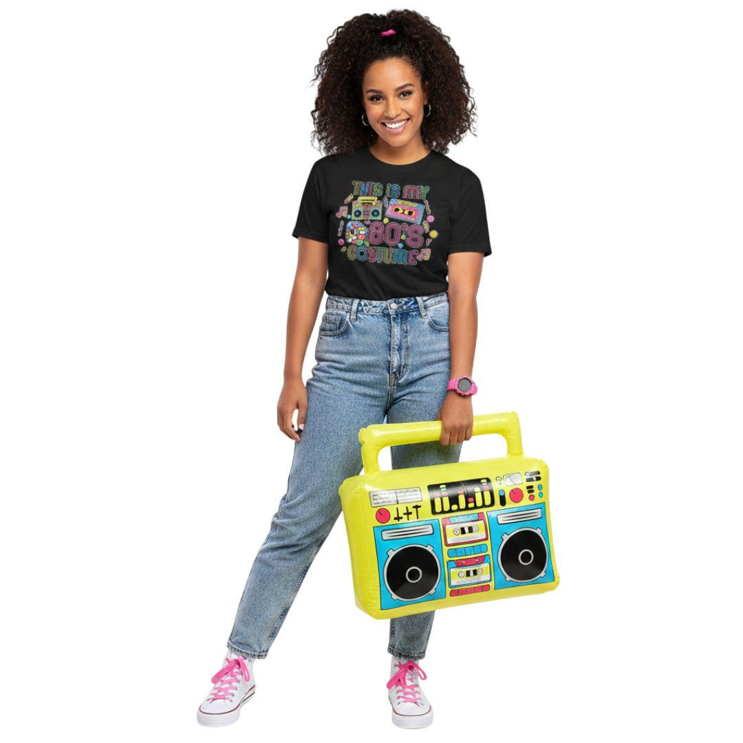 The black short-sleeved tee showcases a bold retro print with the slogan “This Is My 80’s Costume” alongside classic decade icons including a cassette tape, Rubik’s cube, and boom box design. Paired with the bright inflatable boom box accessory, it’s the perfect combination for completing your throwback look.