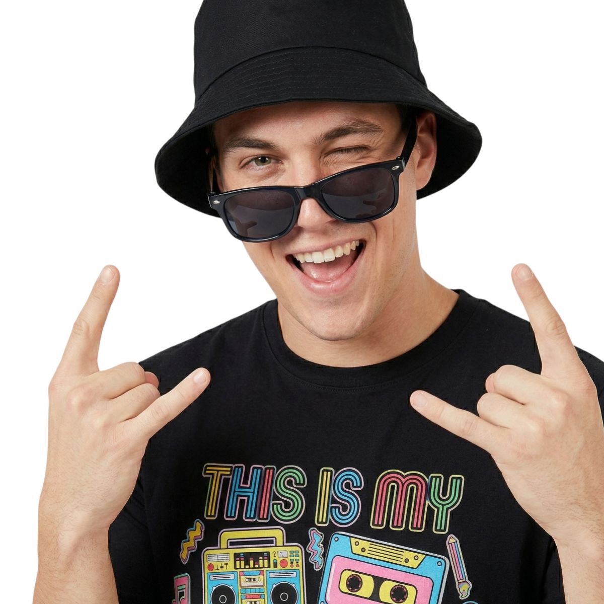Adults 80’s Costume – 4 Piece Set | Black T-Shirt, Glasses, Inflatable Boombox & Black Bucket Hat