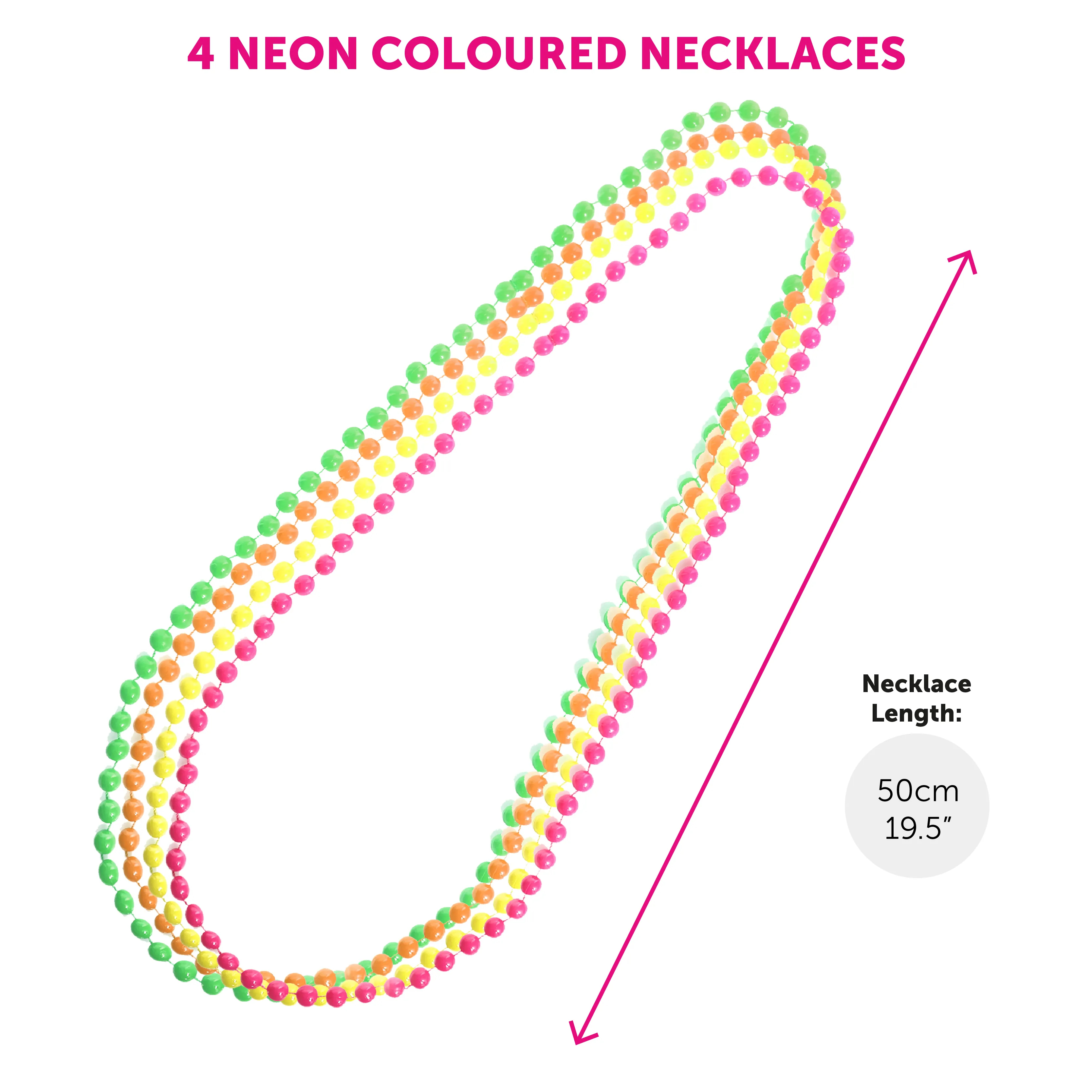 Accessorise your look with a set of neon beaded necklaces, including orange, pink, yellow, and green strands, designed to add bright colour and layered 80s flair. Each necklace is one size, hanging at approximately 50 cm (19.5") when worn.