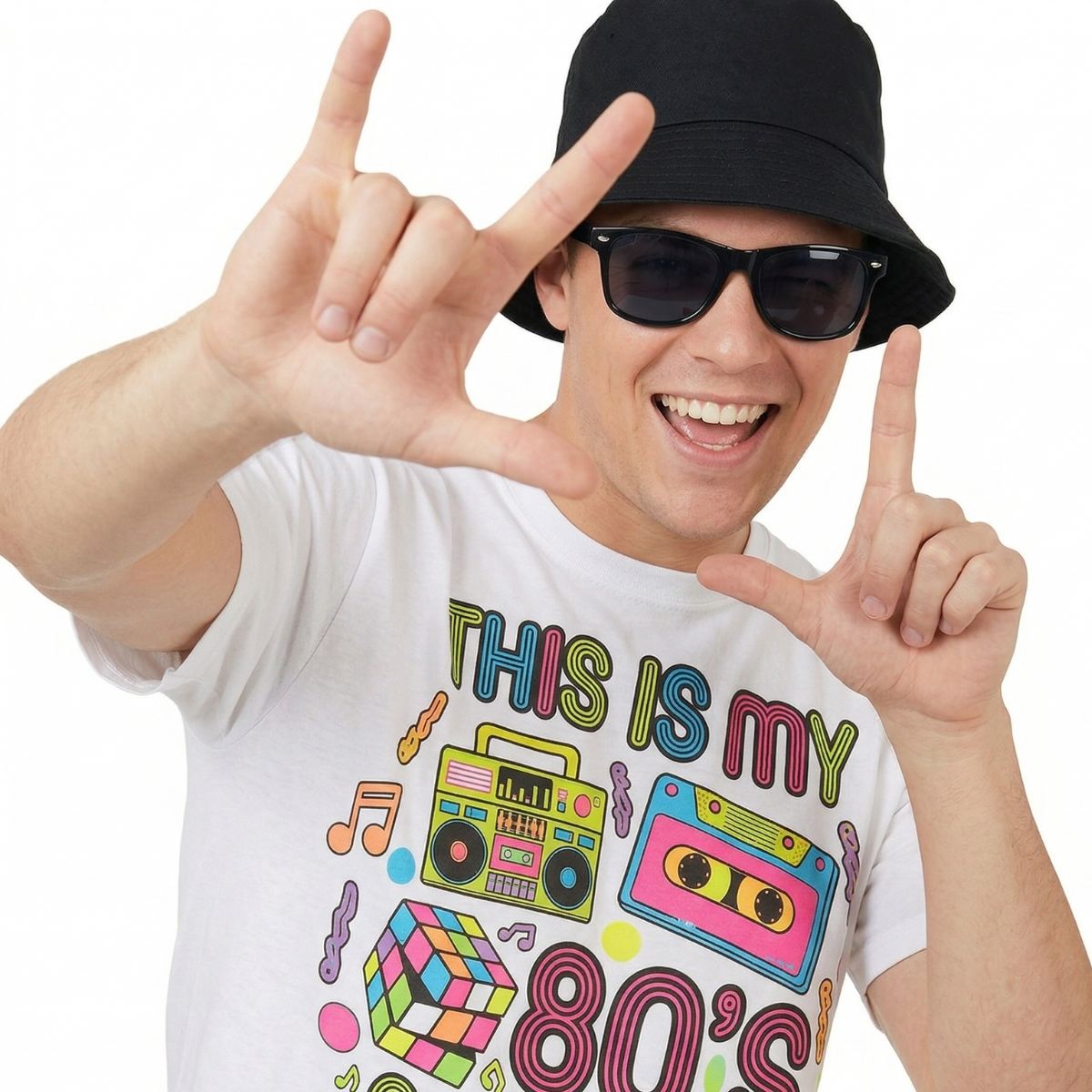 The set includes a white graphic t-shirt featuring a vibrant “This Is My 80’s Costume” slogan, complete with classic boom box, cassette, and Rubik’s cube design. Add the black sunglasses for that effortlessly cool retro look.