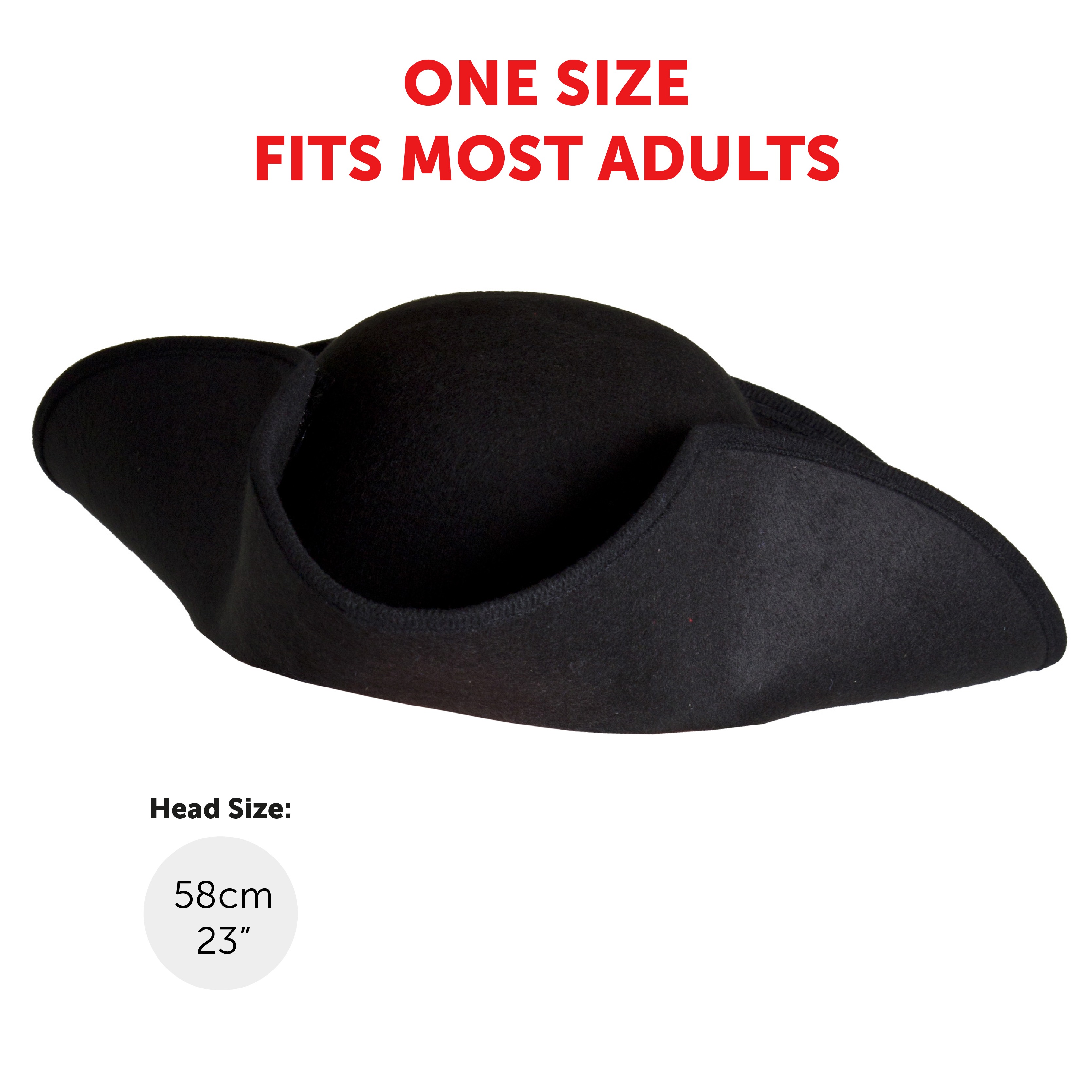 ONE SIZE FITS MOST: Your Adults Tricorn Hat is only available in one size, measuring a head size up to 23" (58cm), a suitable fit for most Adults to wear comfortably!