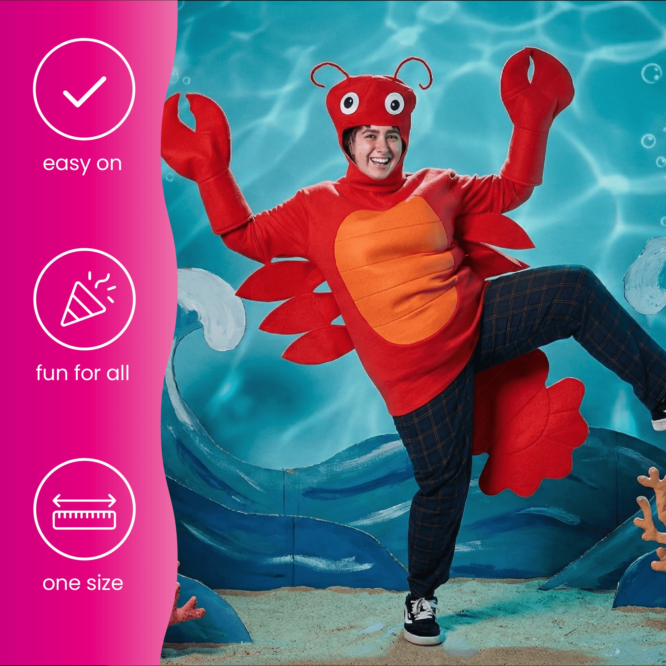 Make a splash at your next fancy dress party with this Adults Lobster Costume — a bright, bold, and brilliantly fun outfit that’s guaranteed to claw its way to the centre of attention.
