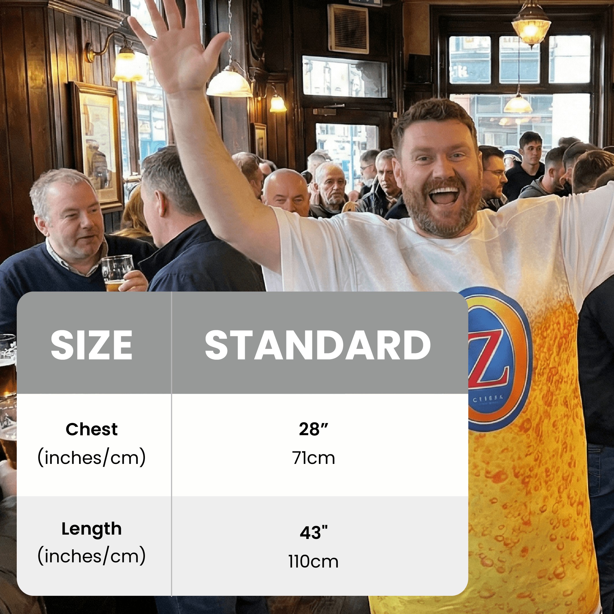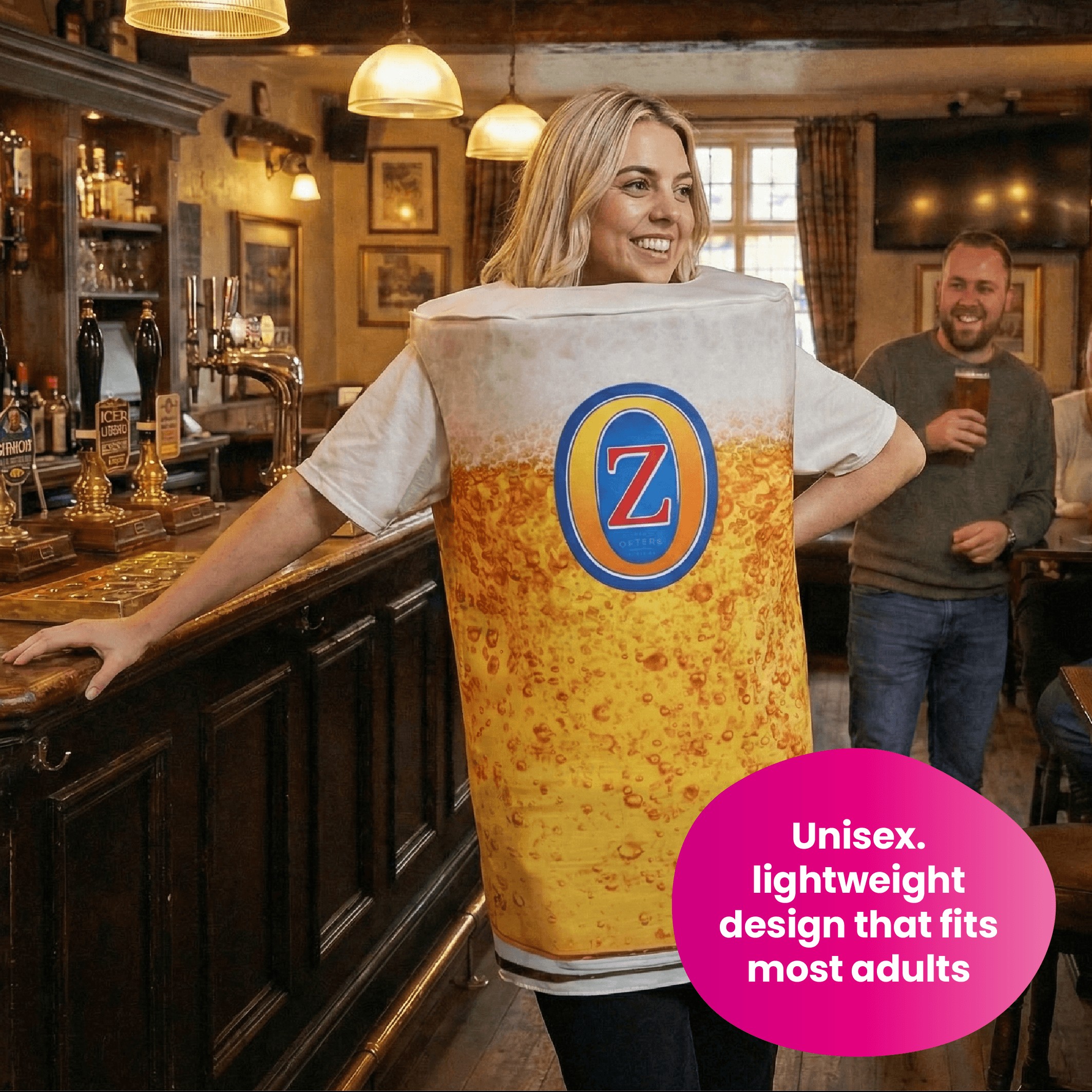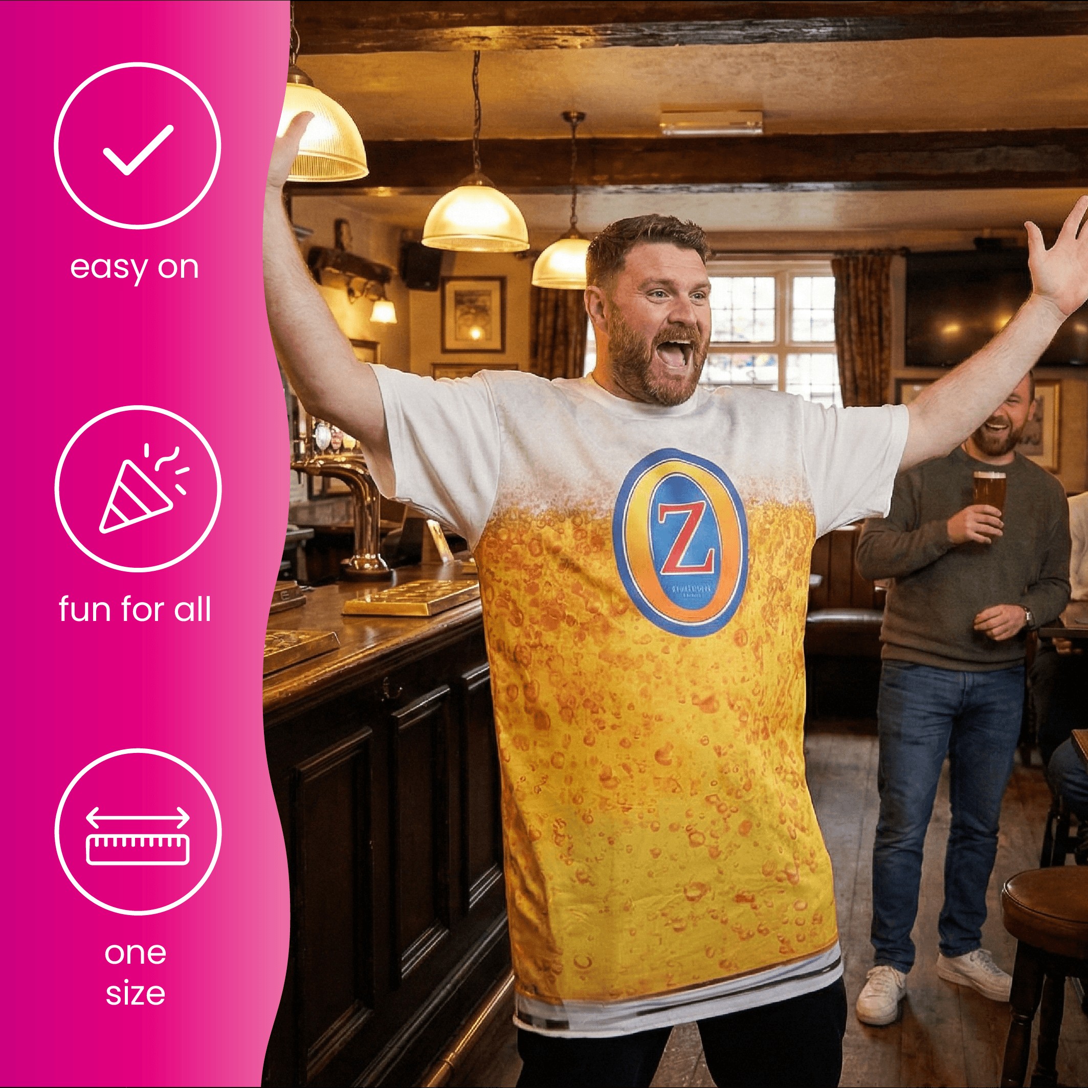 Bring instant laughs to any party with this Adults Novelty Beer Costume, a fun all-in-one outfit designed to slip on easily over your clothes. Perfect for stag dos, darts nights, festivals, themed parties and fancy dress events, this bold Ozters beer-inspired design is made to stand out in any crowd.