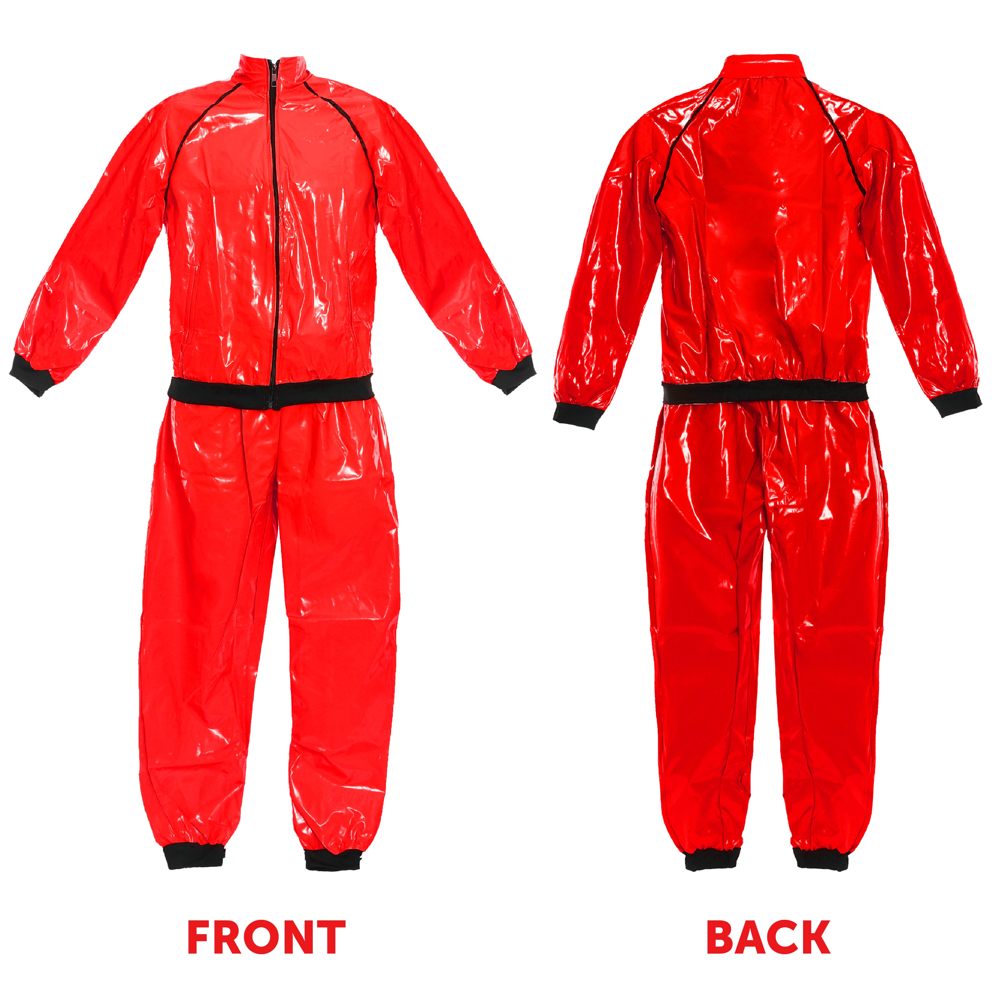 The vibrant red jacket and coordinating trousers create an instantly recognisable factory worker look, while the long black wig can be styled and secured using the attached hair tie for a neat finish.