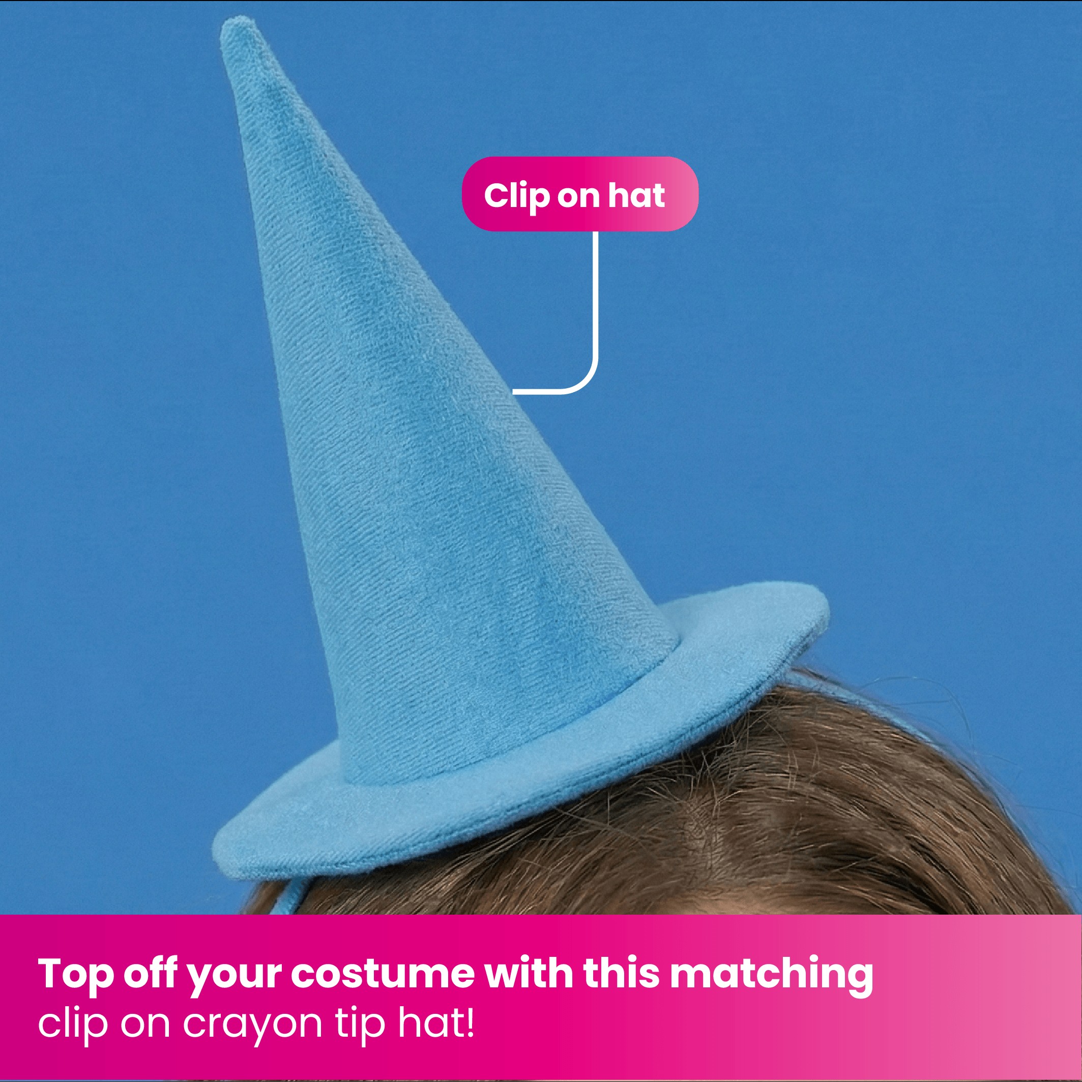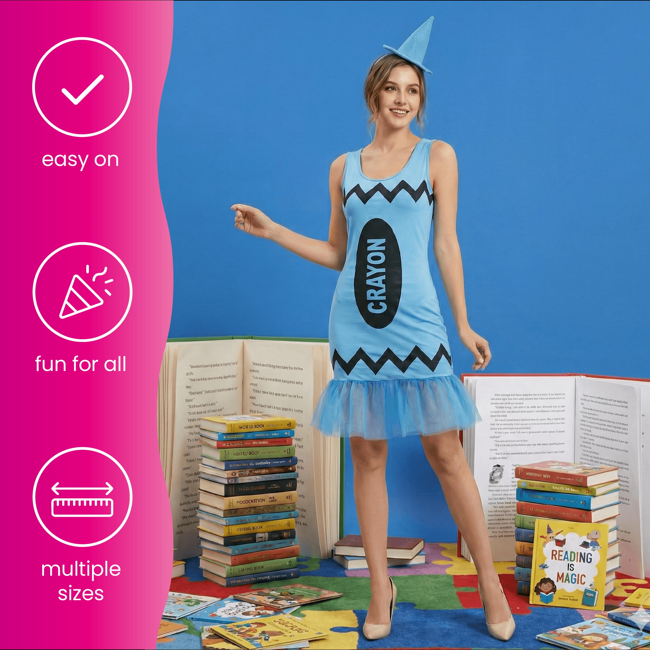 - BLUE CRAYON DRESS DETAILS: Your Ladies Blue Crayon Dress is a Blue Crayon dress with a Tutu skirt attached and a matching Mini Blue clip-on Crayon Hat to complete the look!