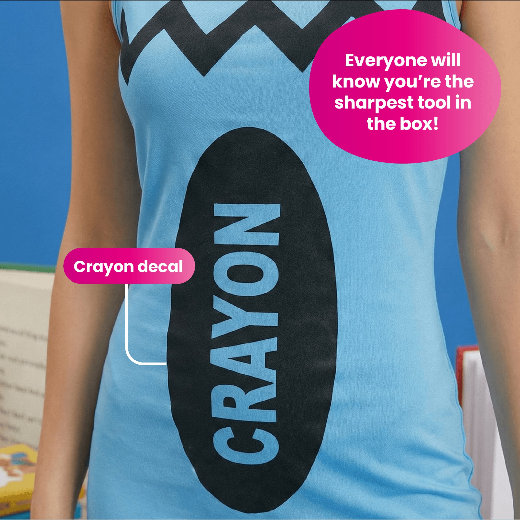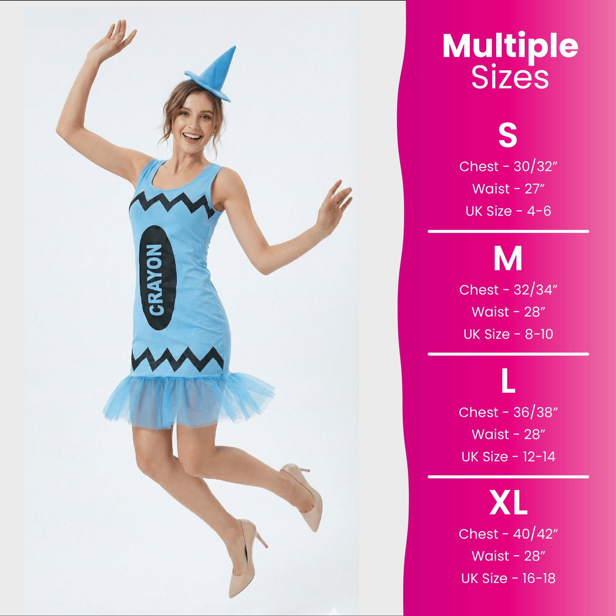 - LADIES BLUE CRAYON DRESS: Fill in the party with colour and laughs at your next big event with your Ladies Blue Crayon Dress and scribble your dance moves into creation!