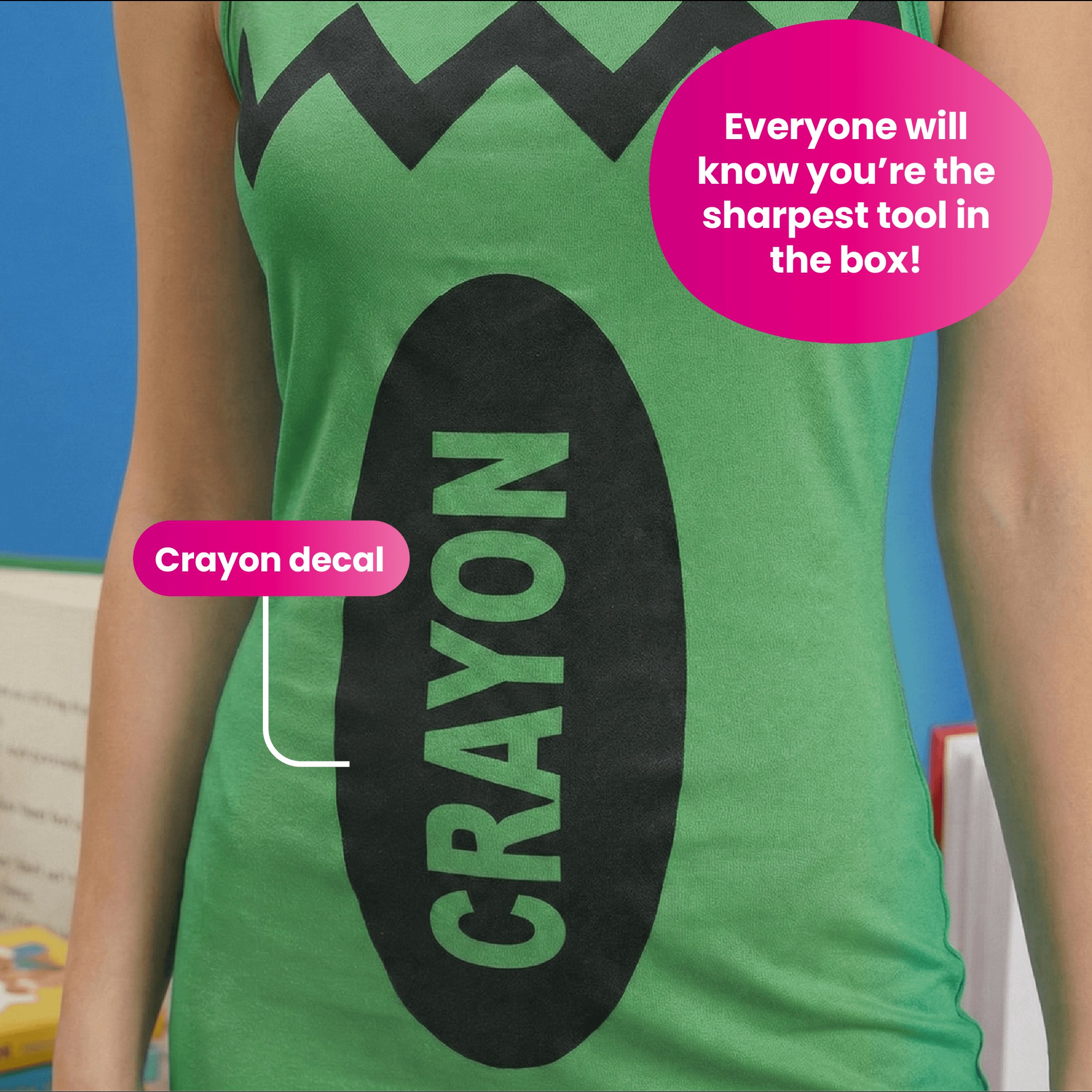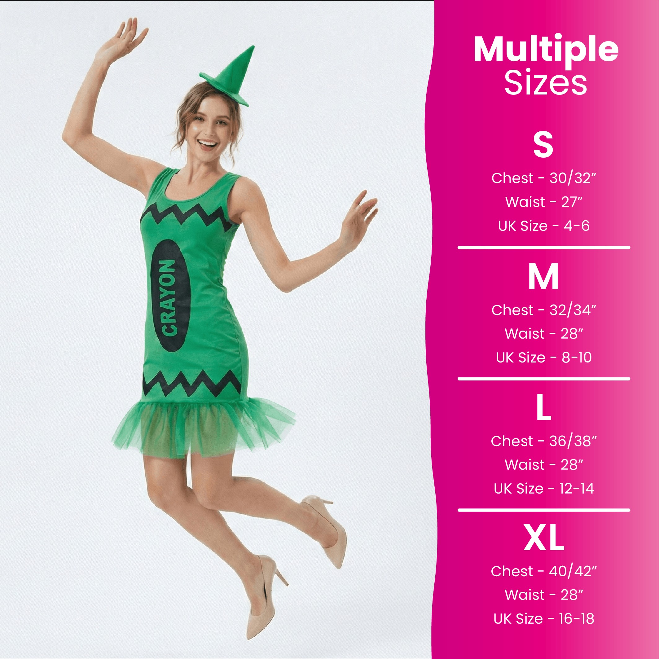 - LADIES GREEN CRAYON DRESS: Fill in the party with colour and laughs at your next big event with your Ladies Green Crayon Dress and scribble your dance moves into creation!