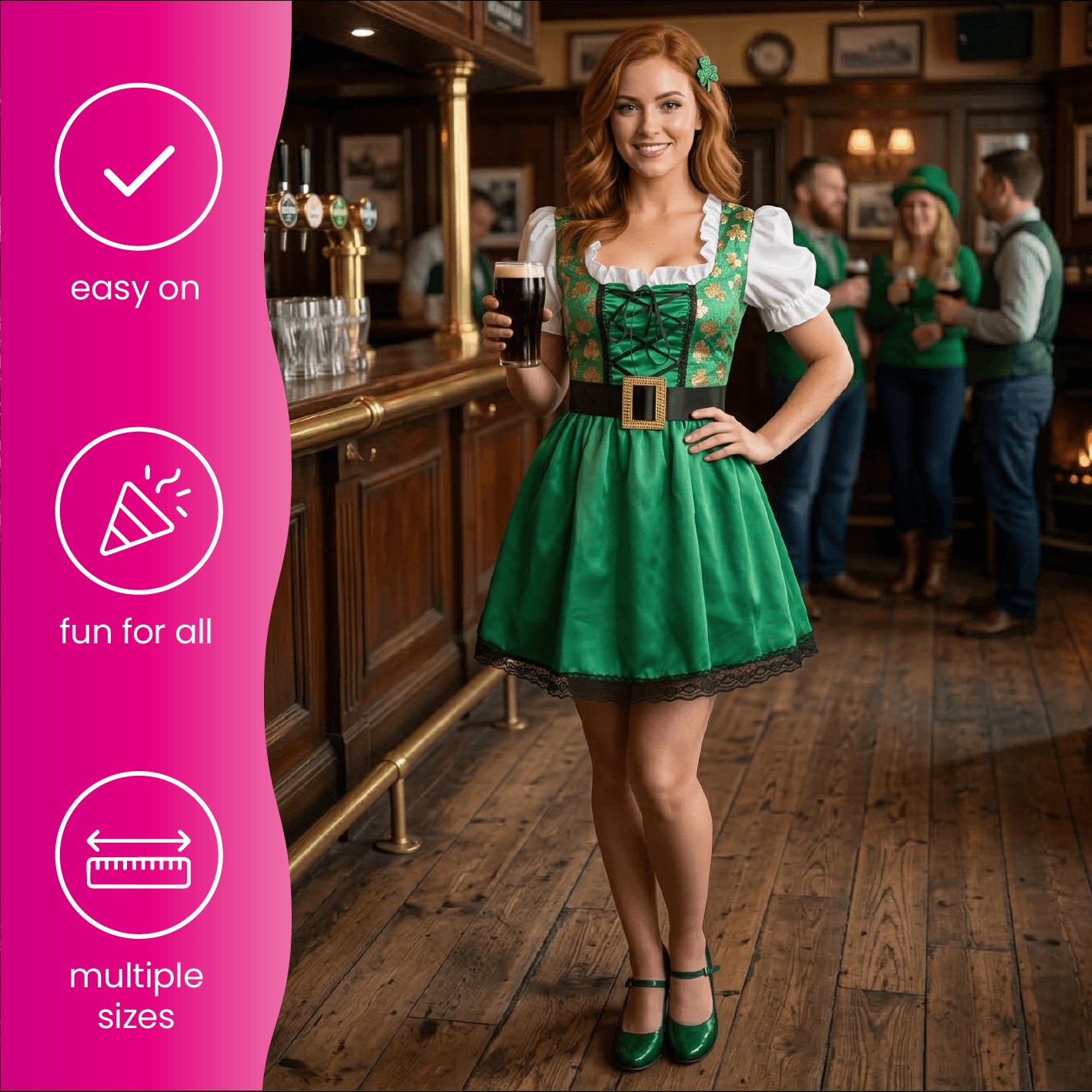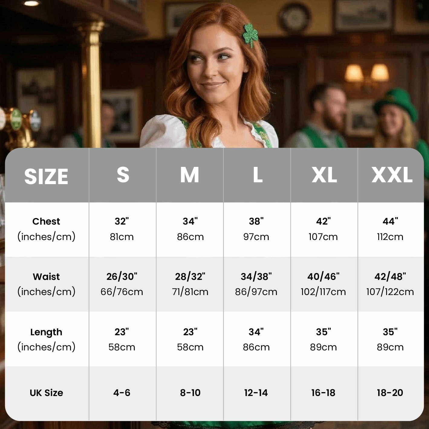 AVAILABLE IN MULTIPLE SIZES: Your Ladies Green St Patrick’s Day Dress is available in multiple sizes from Small to XX-Large: Small (UK 4-6) - Chest: 32"/81cm, Waist: 26-30"/66-76cm, Length: 23"/58cm | Medium (UK 8-10) - Chest: 34"/86cm, Waist: 28-32"/71-81cm, Length: 23"/58cm | Large (UK 12-14) - Chest: 38"/97cm, Waist: 34-38"/86-97cm, Length: 34"/86cm | X-Large (UK 16-18) - Chest: 42”/107cm, Waist: 40-46”/102-117cm, Length: 35”/89cm | XX-Large (UK 18-20) - Chest: 44"/112cm, Waist: 42-48"/107-122cm, Length: 35"/89cm