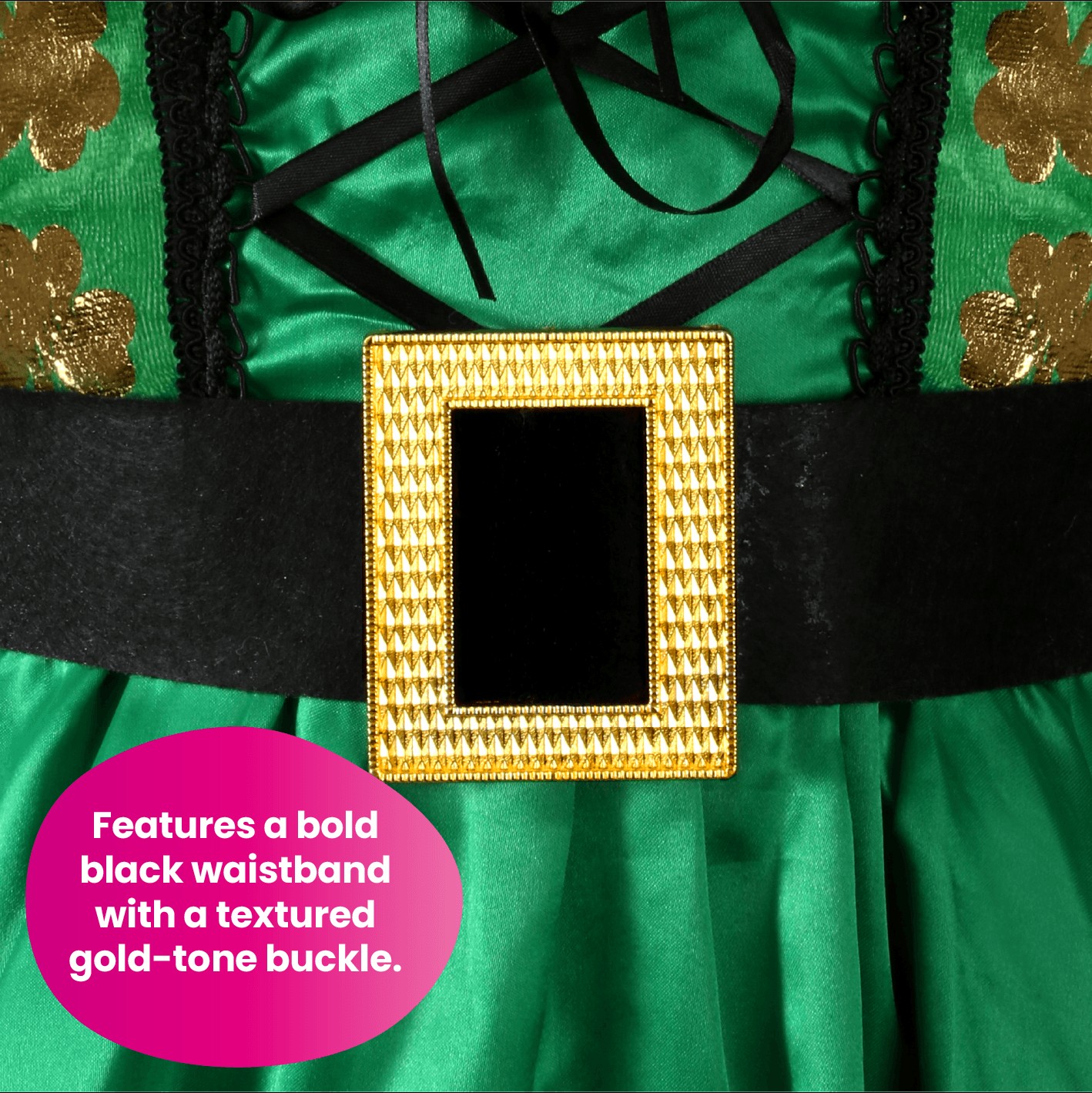 GREEN SHAMROCK IRISH DRESS DETAILS: Your Ladies Green St Patrick’s Day Dress includes a Green Shamrock Dress with Gold Shamrock Print and a Black Belt with Gold Buckle to finish your look!
