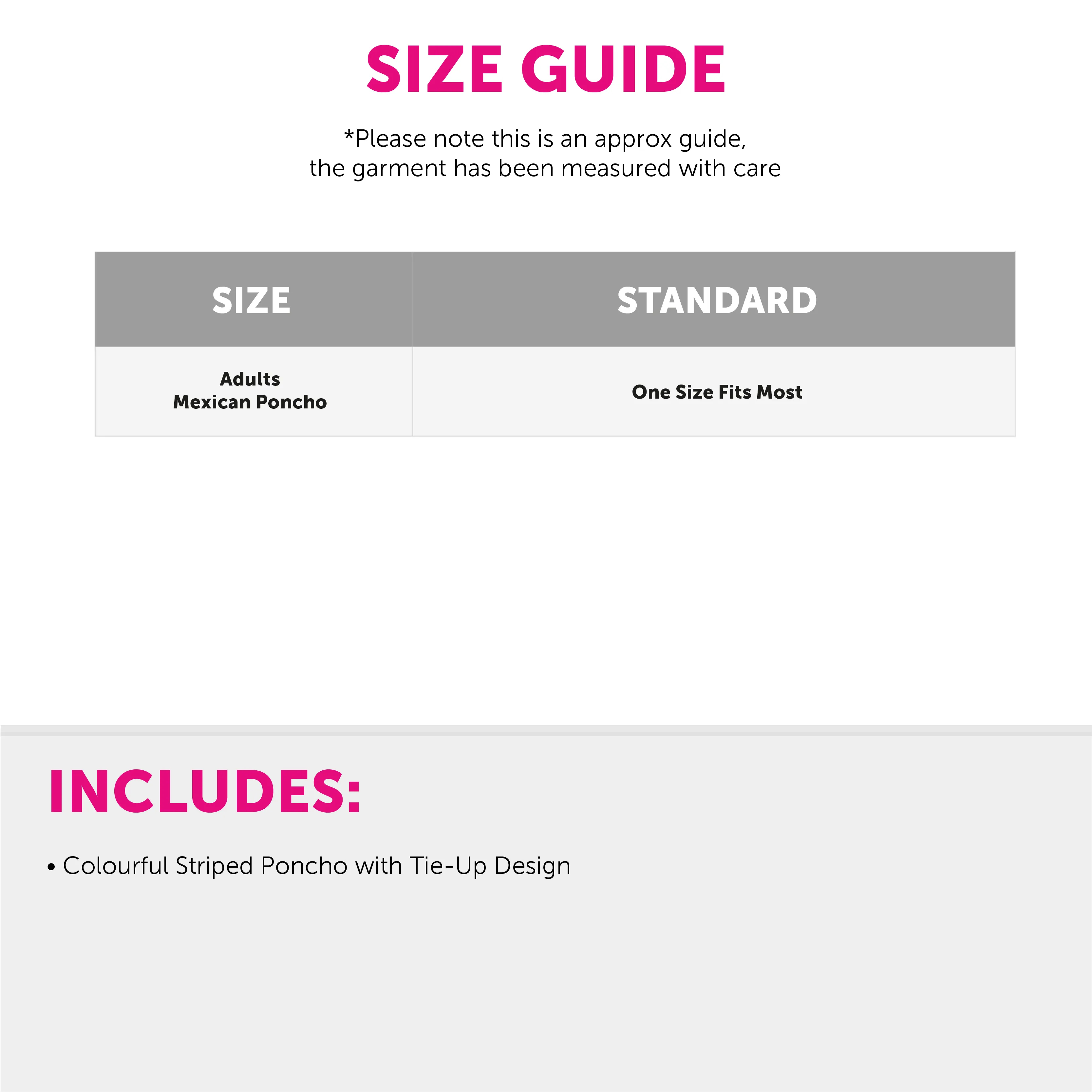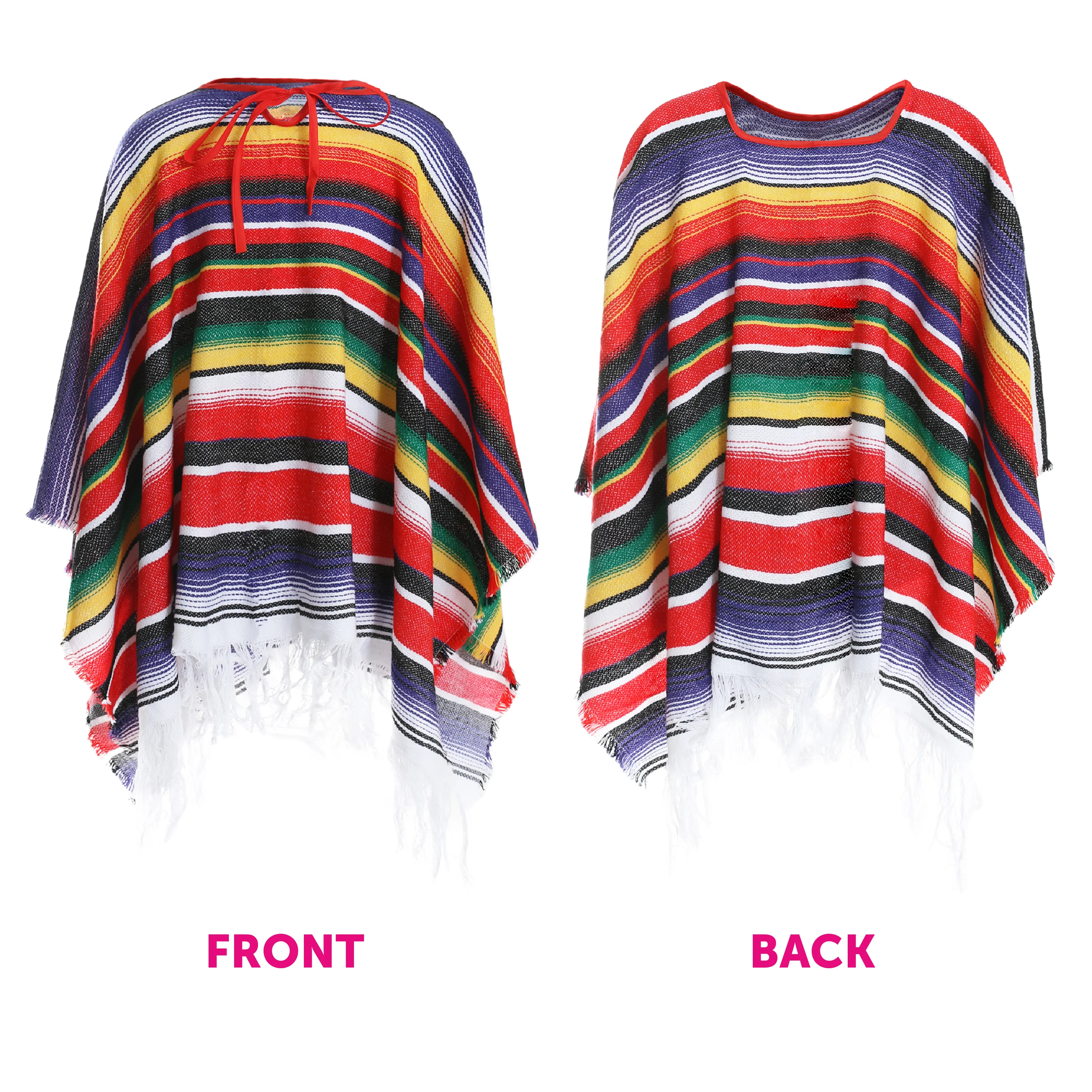 - Includes multi-coloured striped poncho with tassel edging