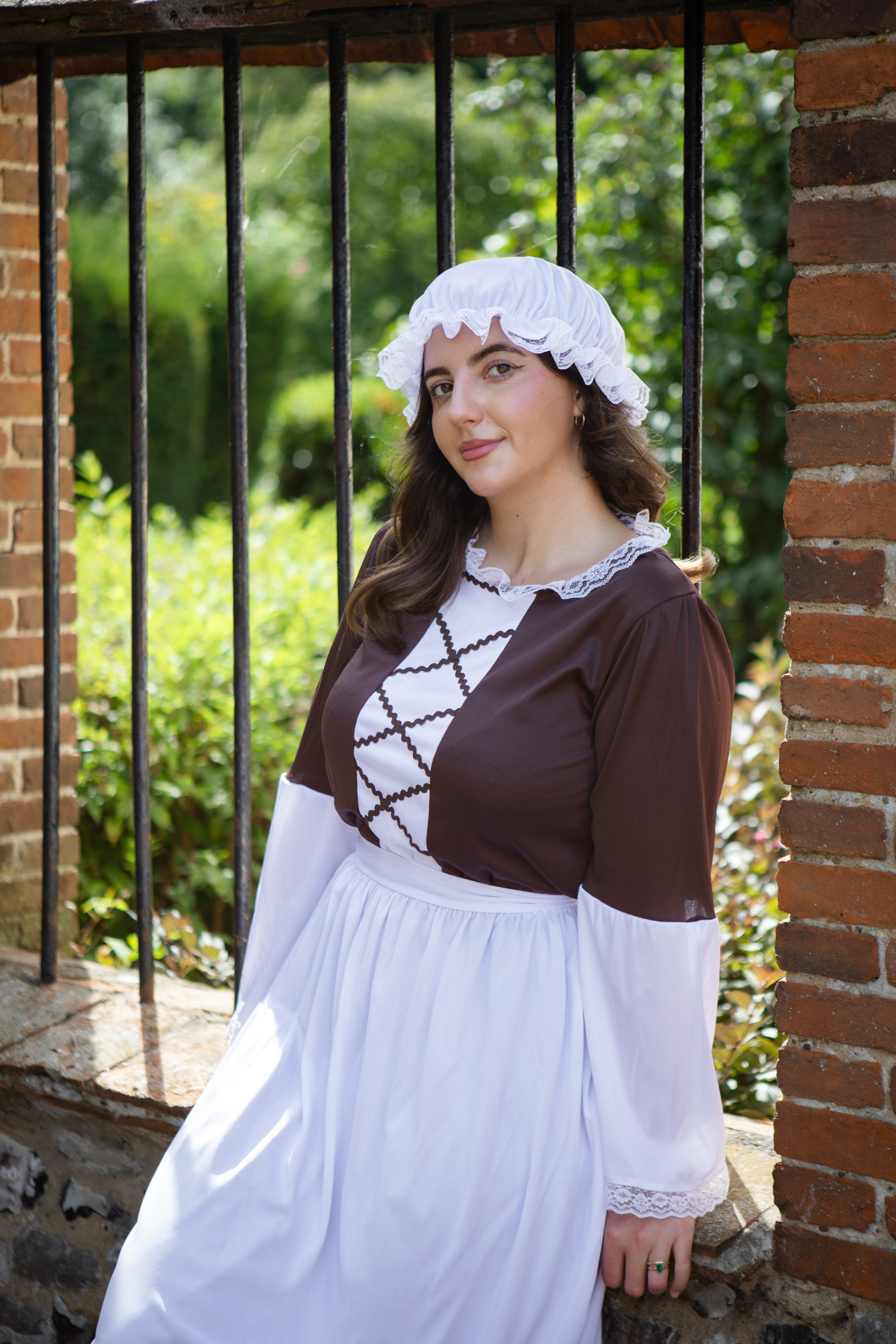 COSTUME INCLUDES: Your Ladies Tudor Maid Costume includes a White Bonnet Hat, a Dark Brown Dress with a Lace Neckline, White Sleeves detailed with delicate Lace edging and a matching detailed White Apron, the perfect Costume for any event!