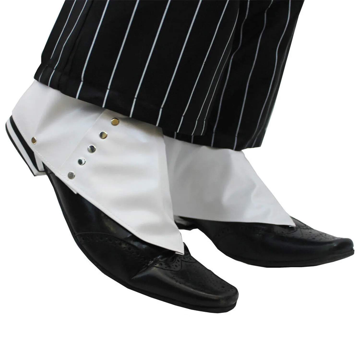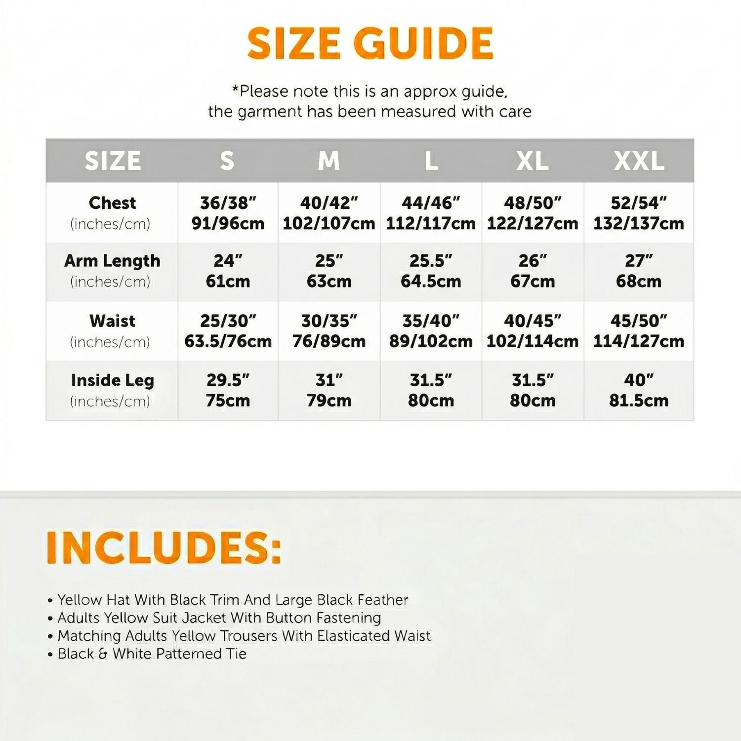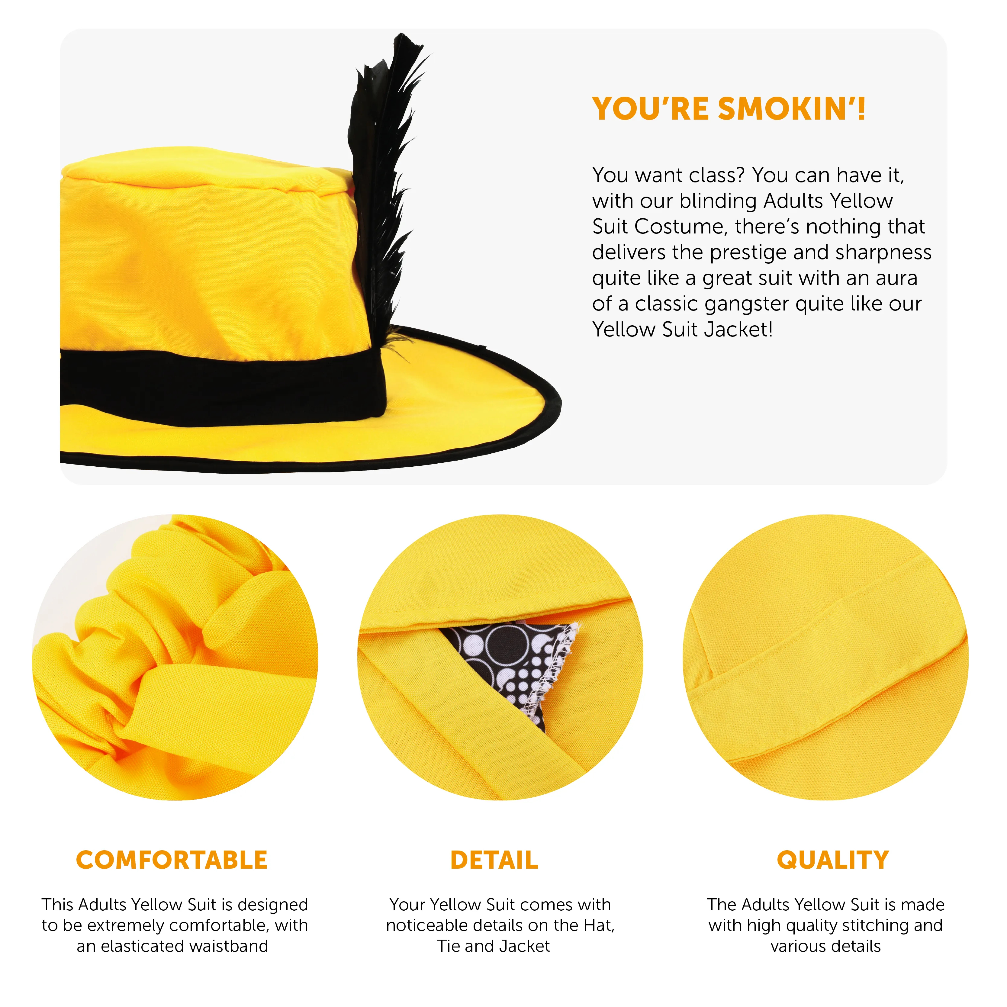 The costume includes a yellow suit jacket with button detail and matching yellow trousers with an elasticated waistband for a comfortable fit. Complete the look with a matching hat, tie, and white spats shoe covers for that classic, sharp style.