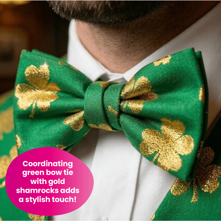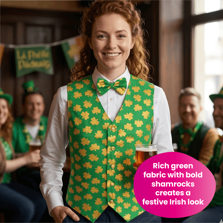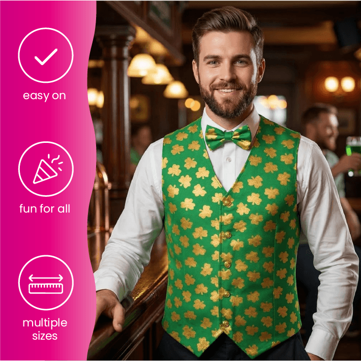 COSTUME INCLUDES: This Adults Irish Waistcoat Costume includes a Green Irish Waistcoat with a Golden Shamrock Print and a Matching Bow Tie on an elastic string, to finish off your outfit perfectly!