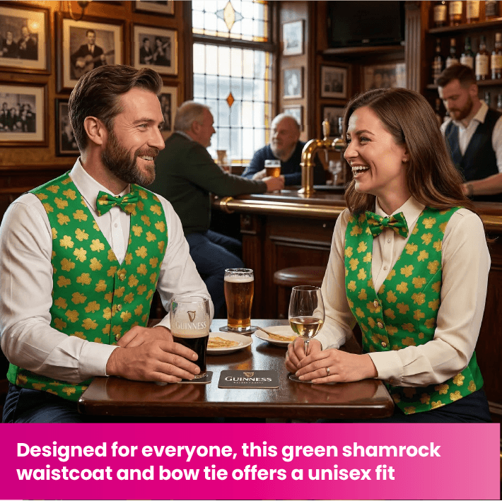 PERFECT FOR ST PATRICK'S DAY: Whether you’re supporting your favourite Irish Sports Team, or need a costume for an Irish party, event, or occasion, make sure that you’re not missing out on our Irish Green Waistcoat and Bow Tie Costume Set!