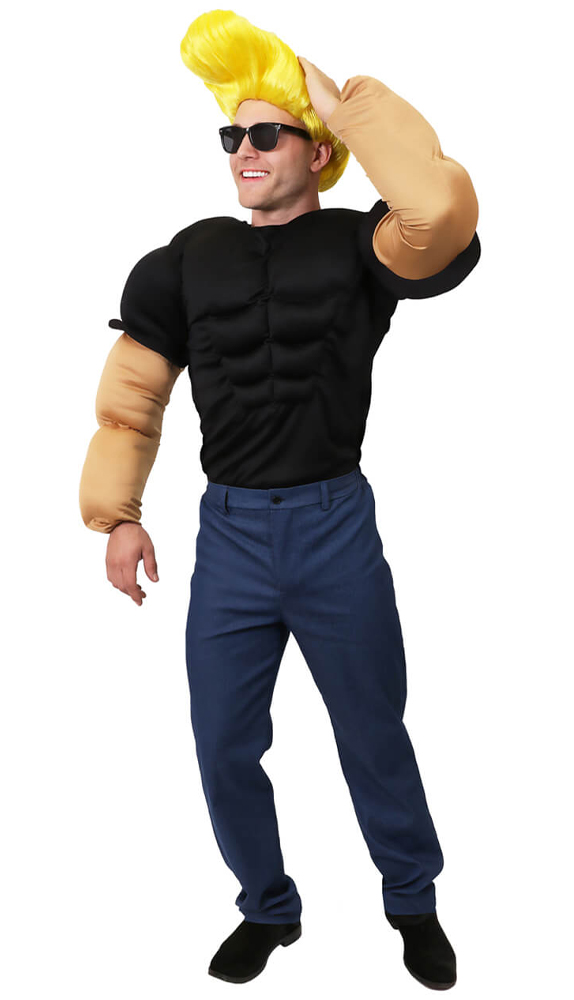 This deluxe costume features plush muscle padding across the torso and sleeves, so you don't have to worry about hitting the gym to complete this look! With the iconic Blonde Quiff wig and glasses, only the true 90s kids will appreciate the time spent in designing this nostalgic look. Finally, a Johnny Bravo costume would not be complete without the classic blue trousers!