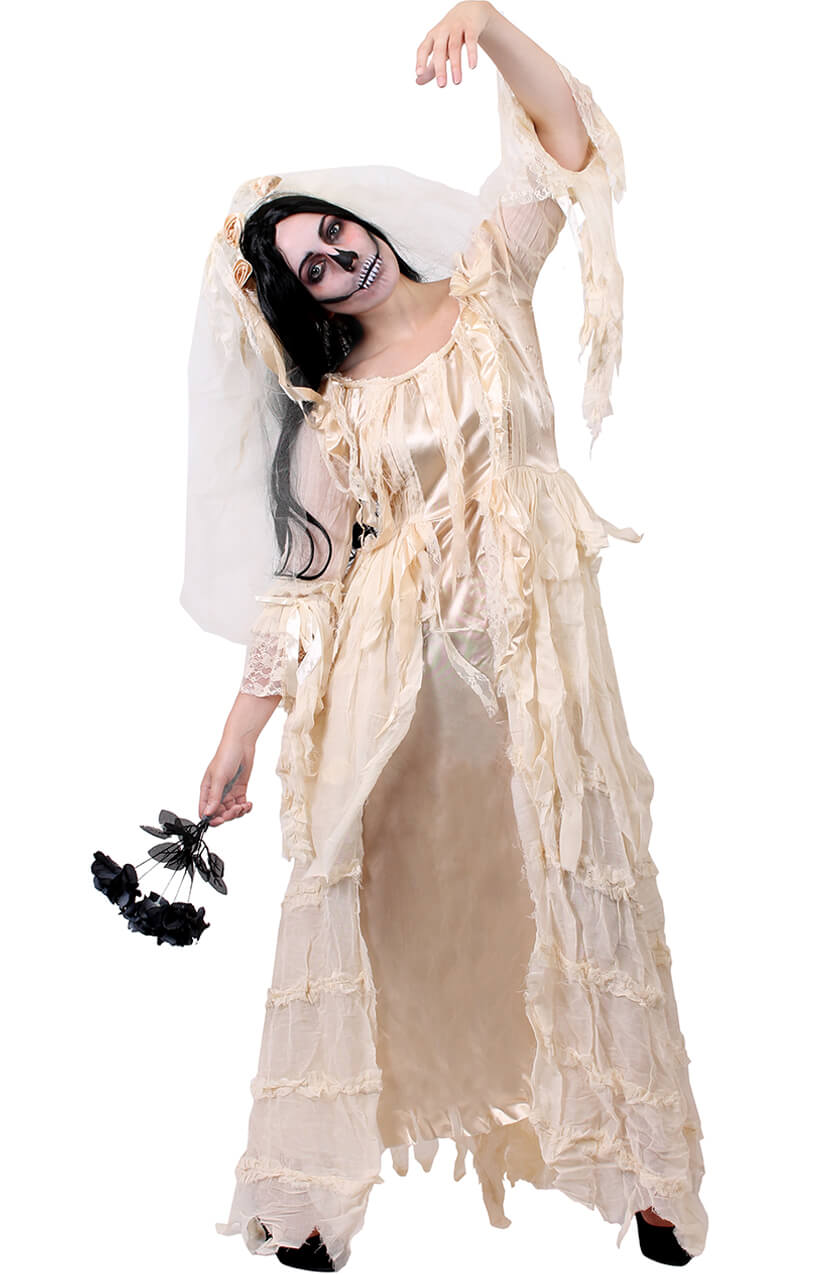 Poor Havisham, after she got left at the altar, she continued to stand there waiting for her love in her silk white wedding dress, she stood for so long that she died and came back to life and continue to wait for her groom! Now you can continue her legacy and uphold her once renowned beauty and show her Great Expectations in the next life at the heart of the Halloween parties this coming year! It comes with makeup and a black rose bouquet to add to the mystic silent horror even more!