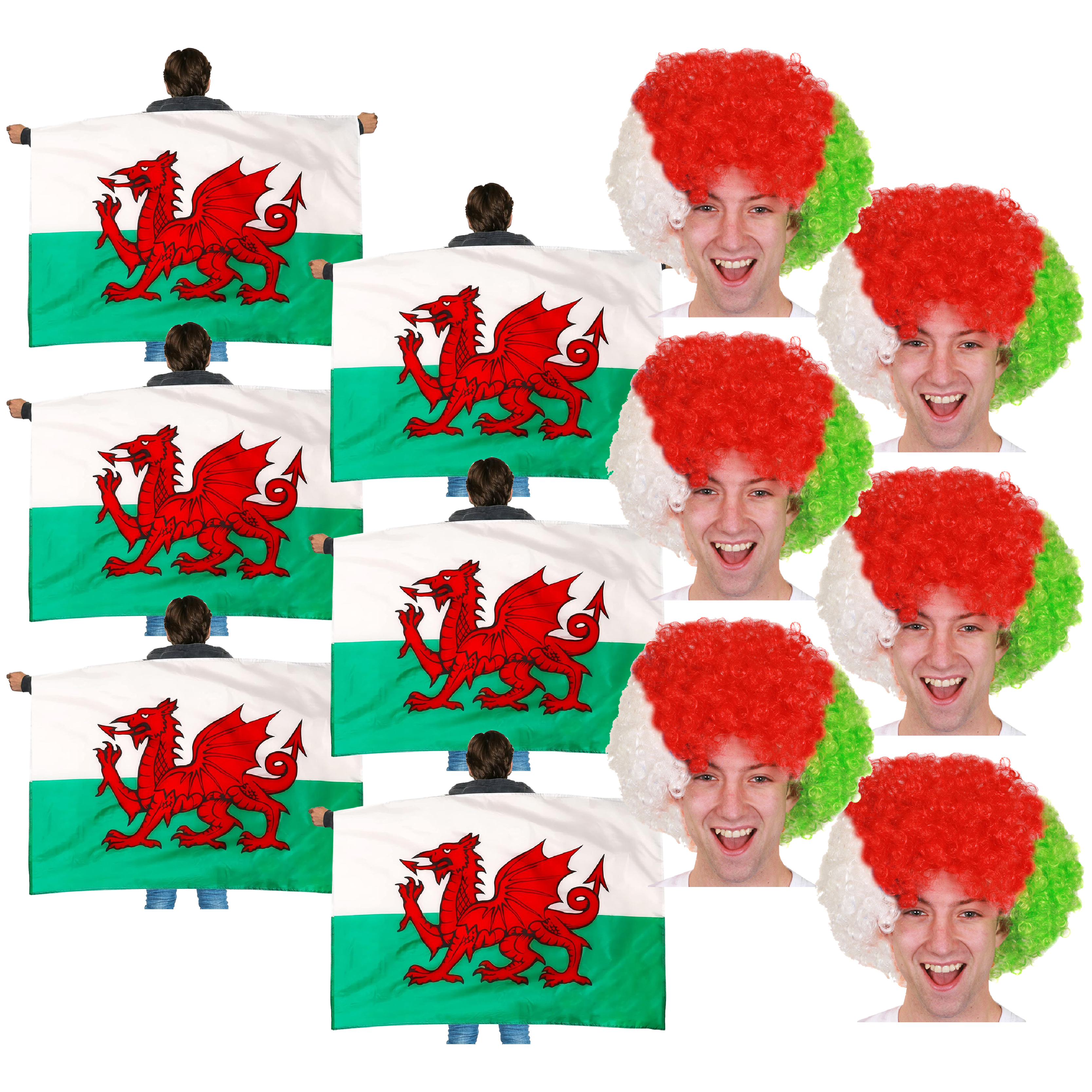 6X Welsh Supporters Afro Wig & 6X Cape Flag