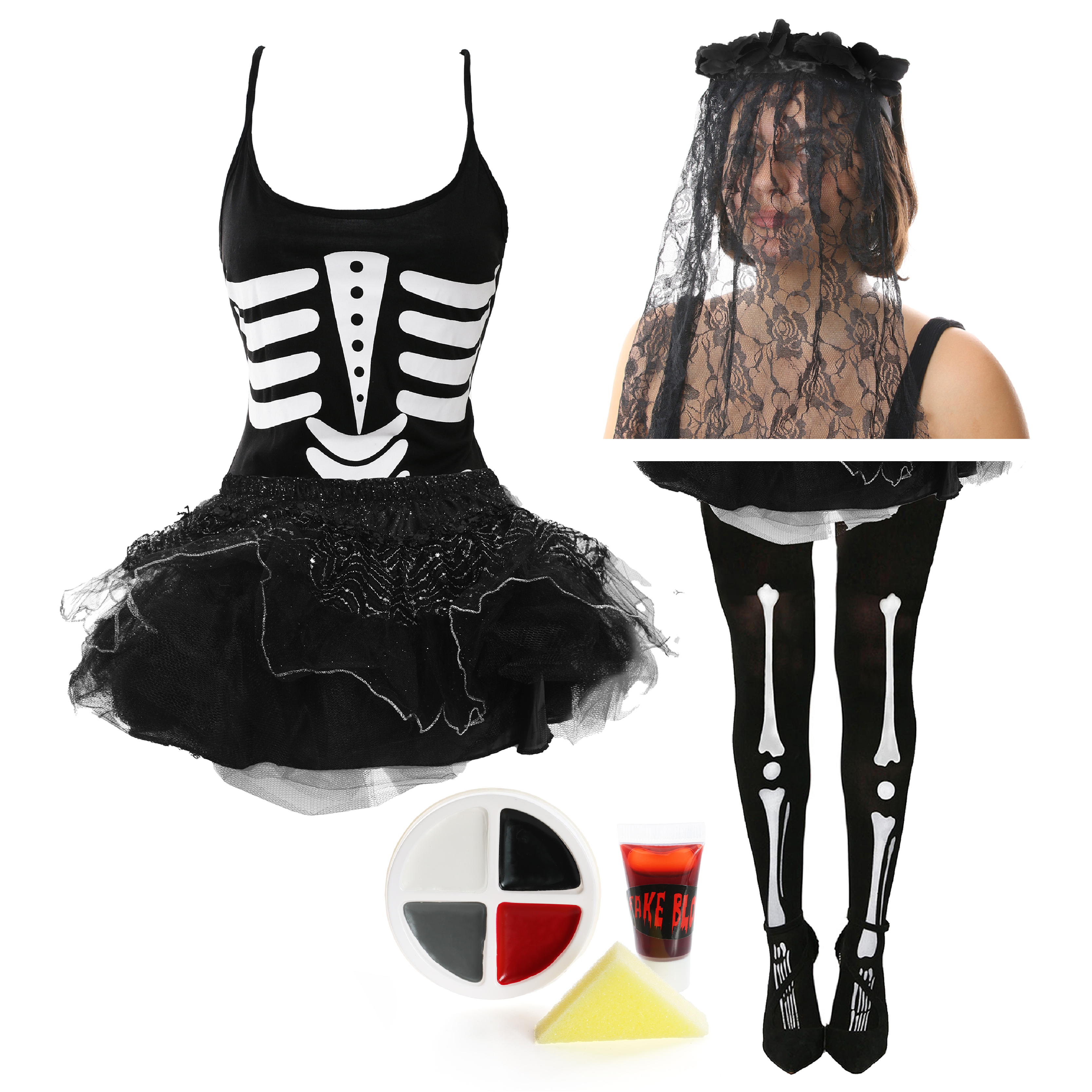 Ladies Skeleton Tutu Dress with Tights, Bride Veil