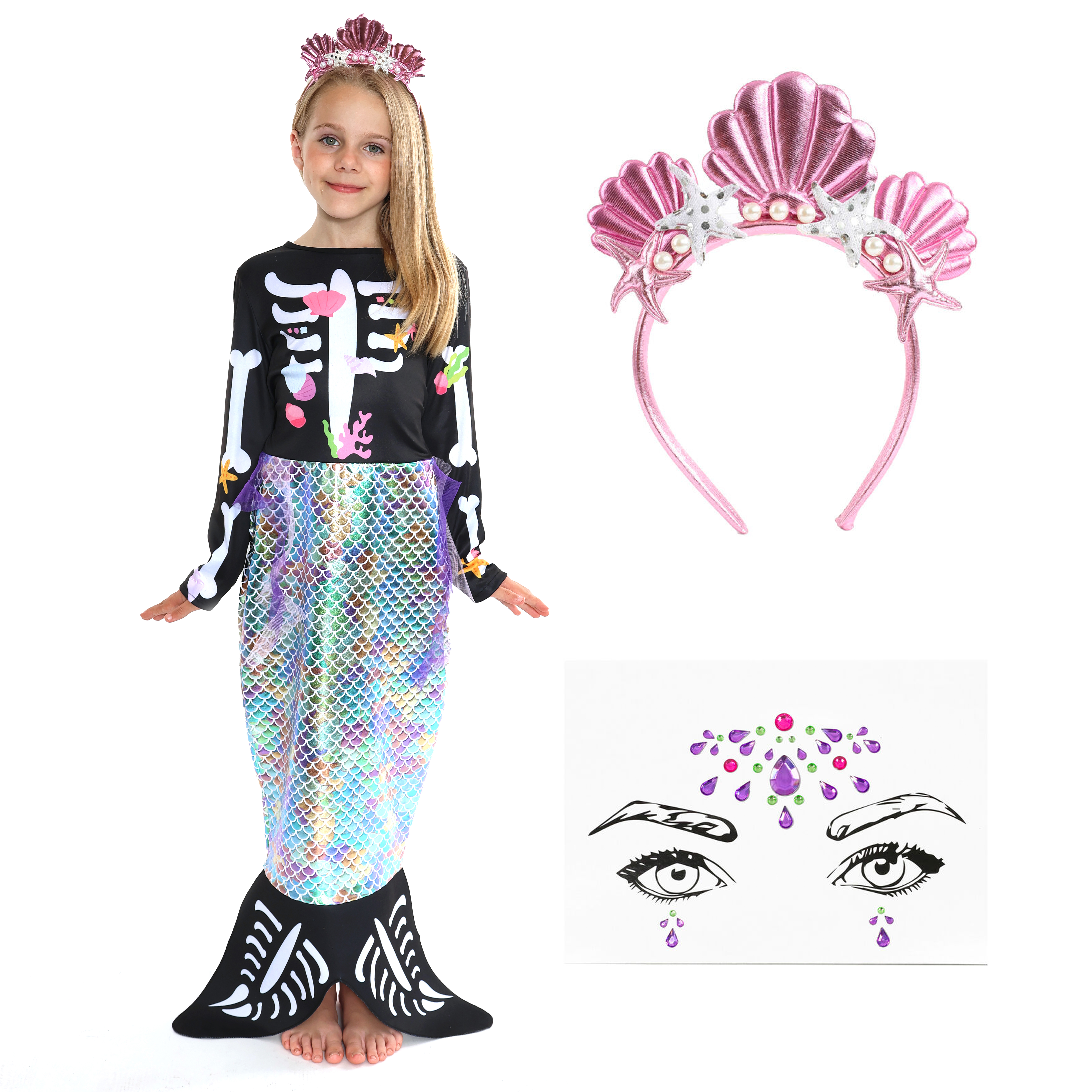 Child's Skeleton Mermaid Costume with Crystal Face