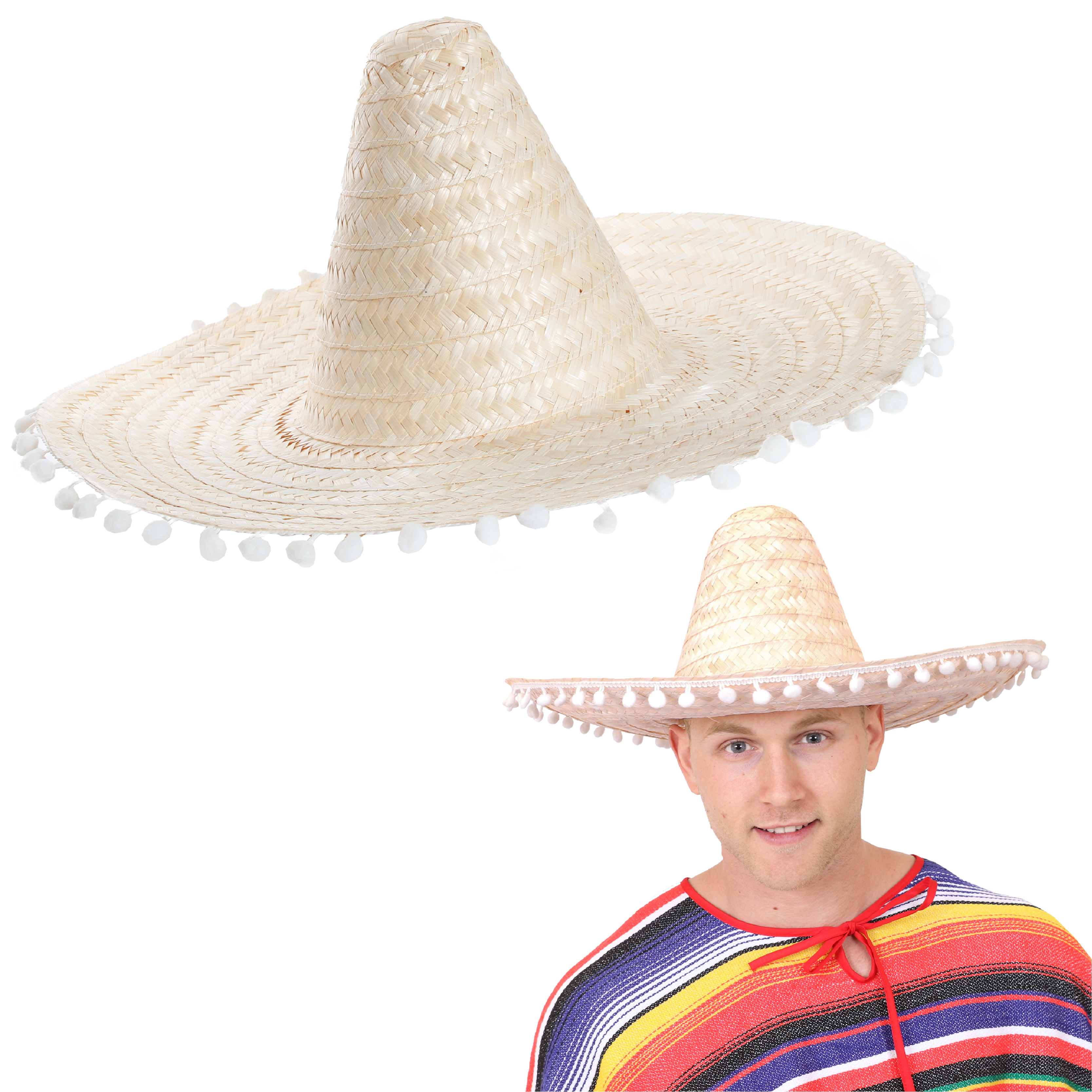 Natural Mexican Sombrero with Pom Pom Edging