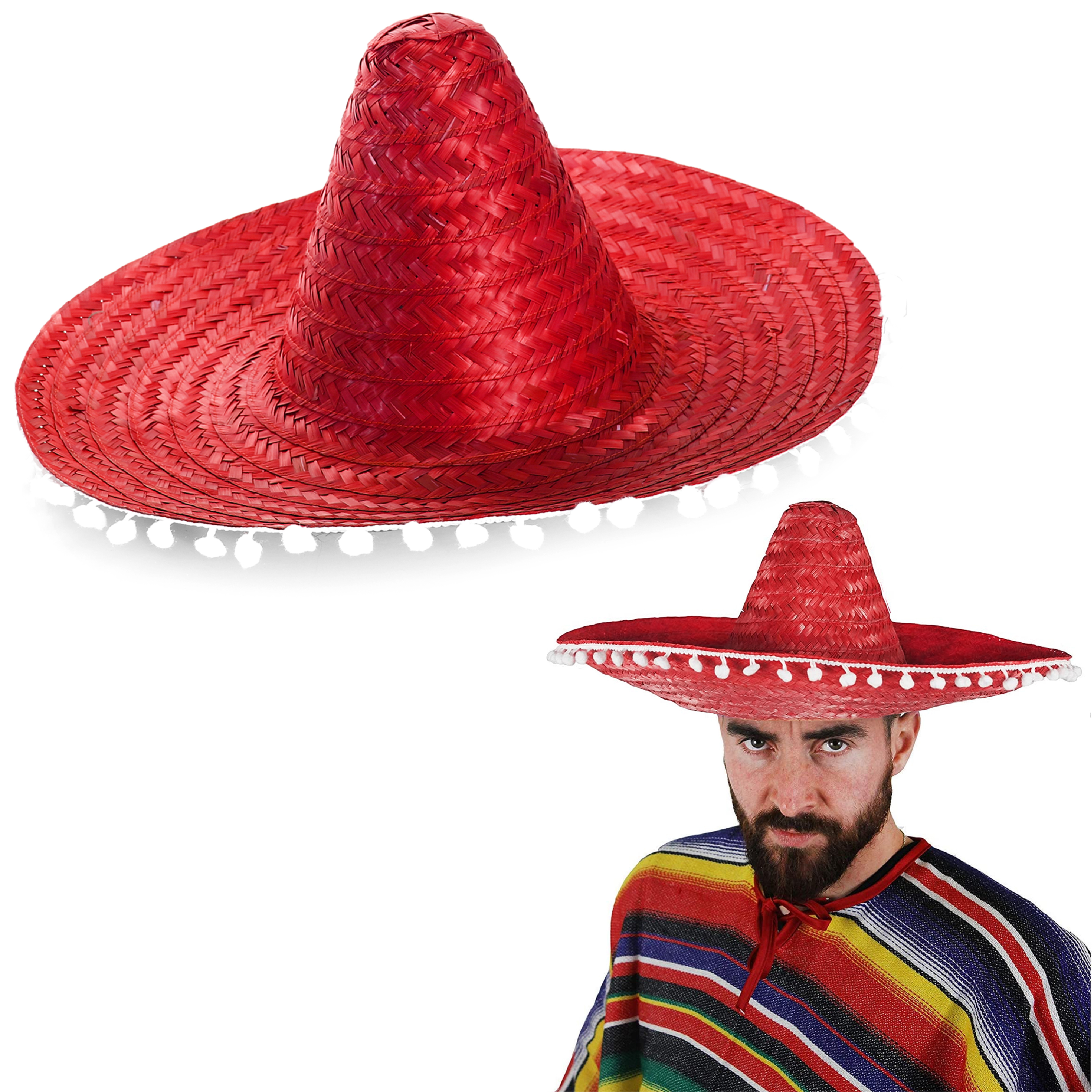 Red Mexican Sombrero with Pom Pom Edging