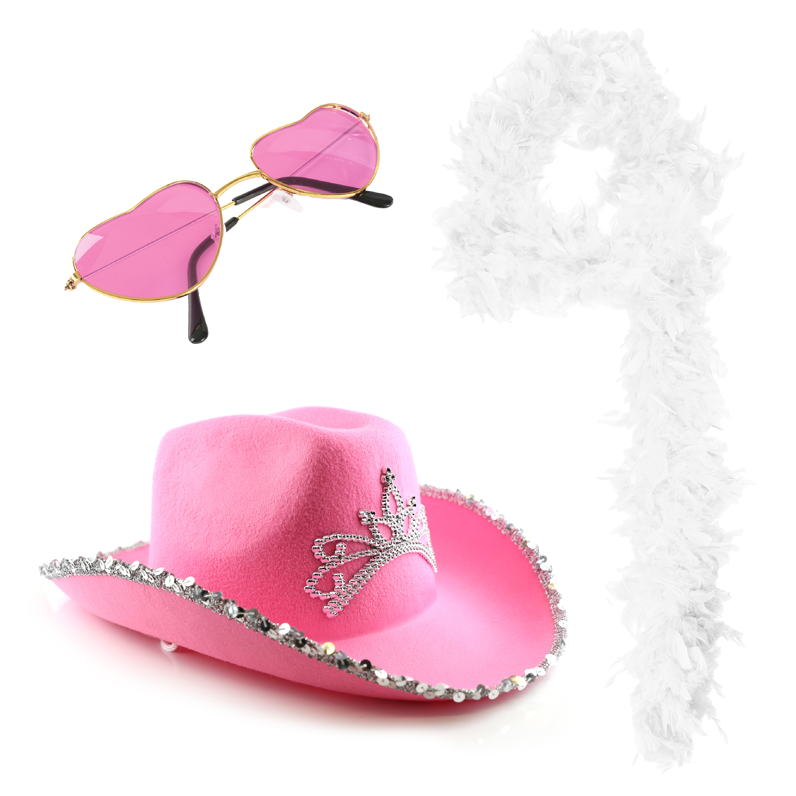 Tiara Cowboy Hat, Hot Pink Boa & Pink Heart Glass