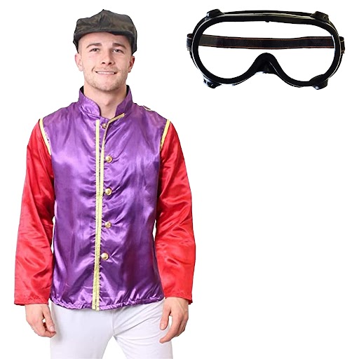 Adults Purple & Red Jockey Costume with Black Gogg