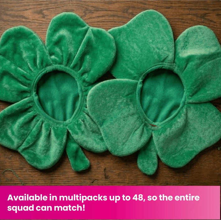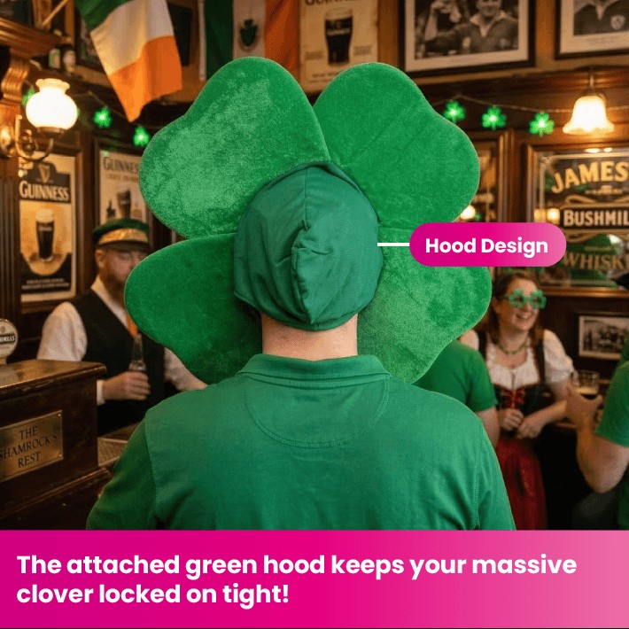 HAT INCLUDES: This Four Leafed Clover Supporters Hat includes a Jumbo Four Leaf Clover Velour Feel Hat, with an attached green hood!