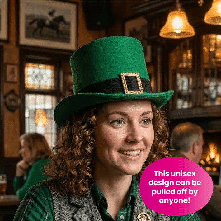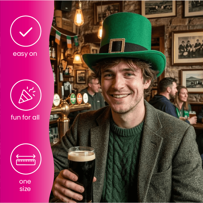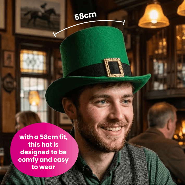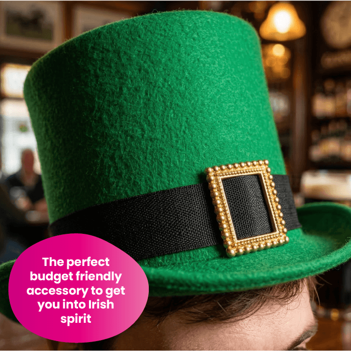 COMPLETE YOUR IRISH COSTUME: If you already have an Irish costume prepped and ready, whether it’s just green-themed, or a Leprechaun fancy dress, then complete your look with our Irish Buckle Top Hat and you’re ready to go!