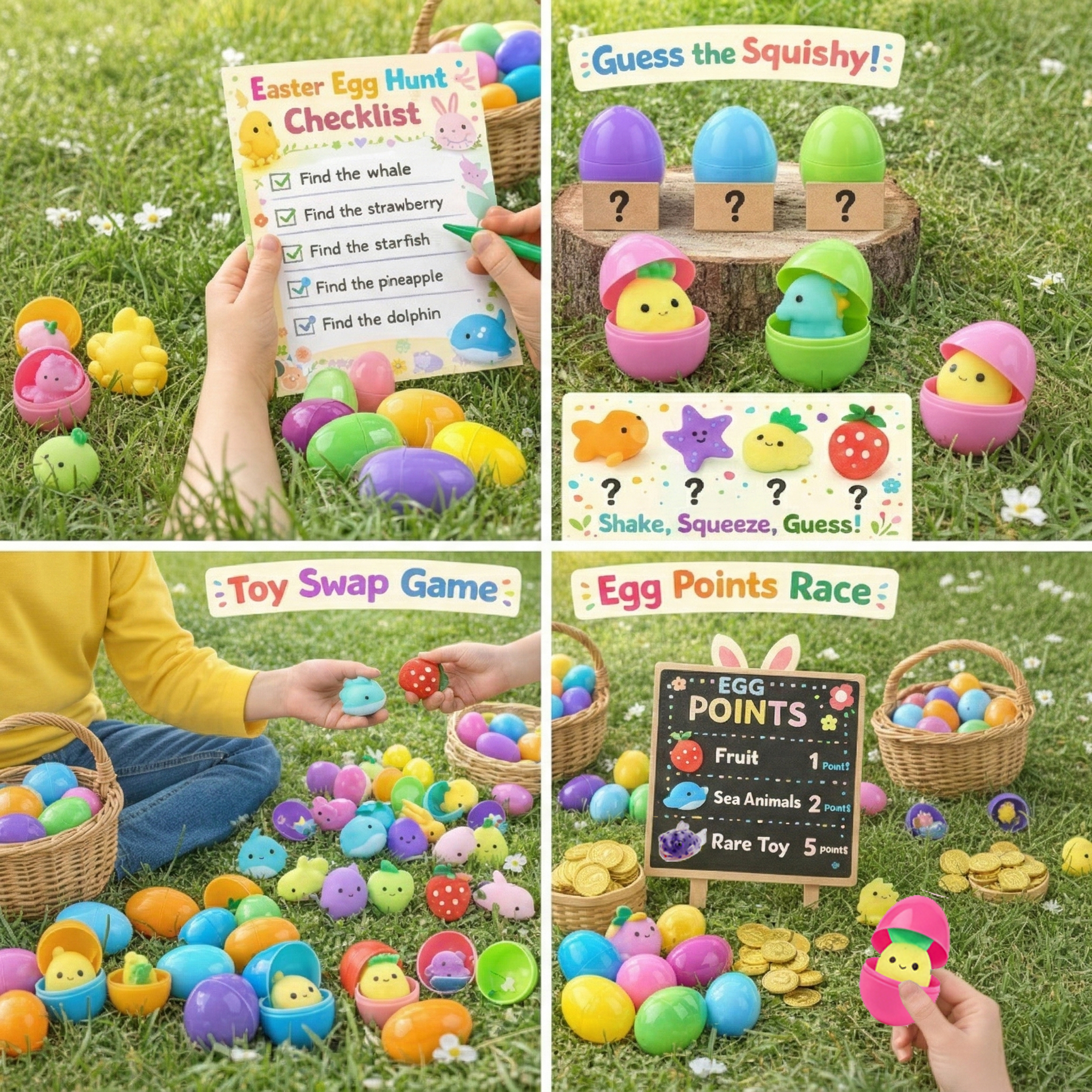 Easter Egg Hunt Toy Set – 48 Pieces – Fillable Eggs, Fruit Squishies & Sea Animal Squishies with Beads