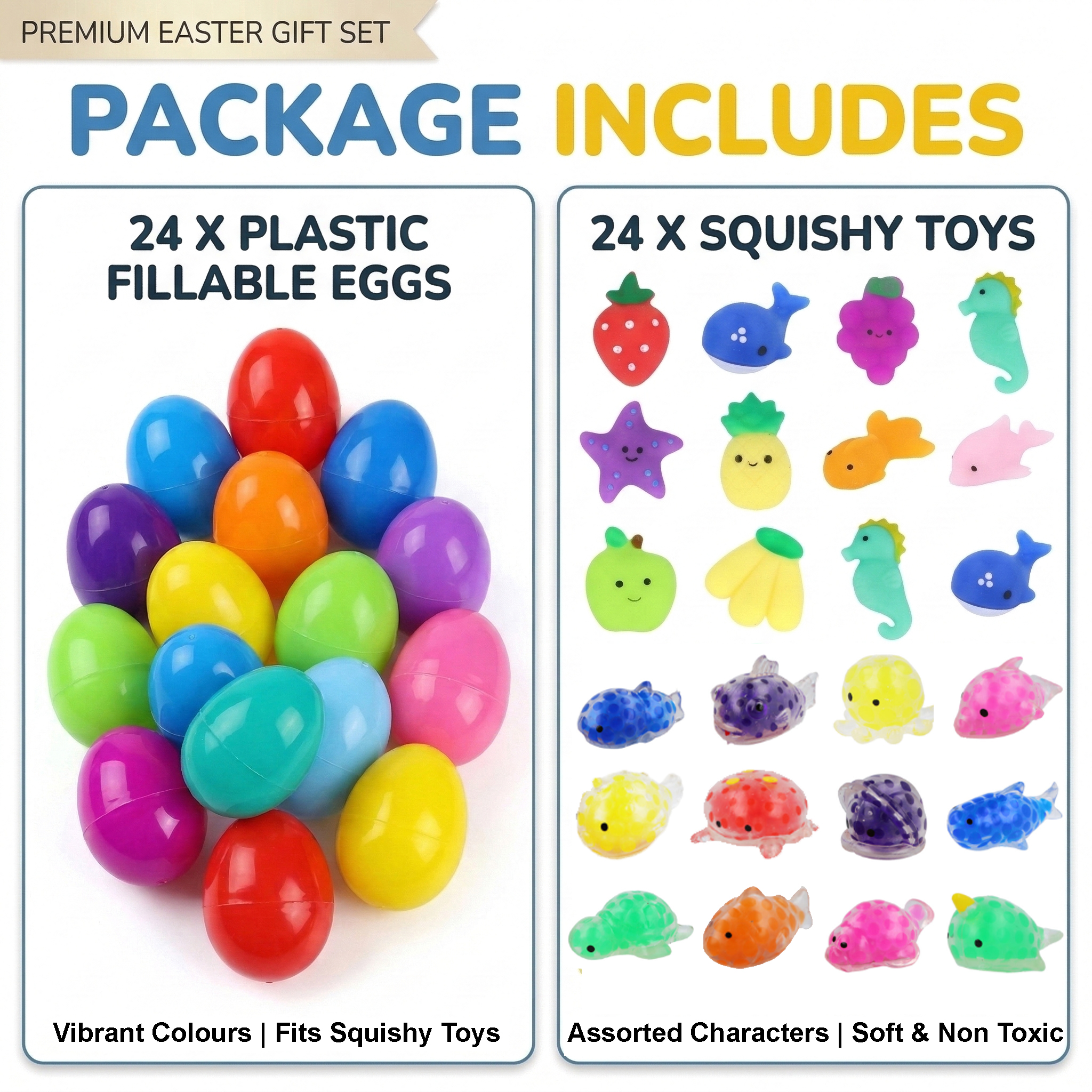 Make Easter celebrations even more exciting with this 48-piece Easter egg hunt set, perfect for creating a fun and memorable hunt for children. This colourful bundle includes 24 fillable egg capsules, 6 fruit squishies, 6 mini sea animal squishies, and 12 mini sea animal squishies with beads, giving kids lots of fun surprises to discover.