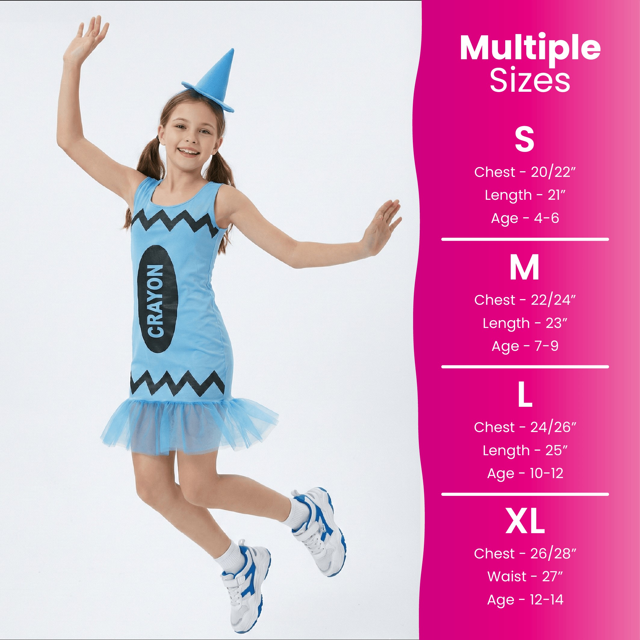 AVAILABLE IN MULTIPLE SIZES: Your Child’s Blue Crayon Dress is available in multiple sizes from Small to X-Large: Small - 4/6 Years, Chest 20/22", Length 21" | Medium - 7/9 Years, Chest 22/24", Length 23" | Large - 10/12 Years, Chest 24/26", Length 25" | X-Large - 12/14 Years, Chest 26/28", Length 27"