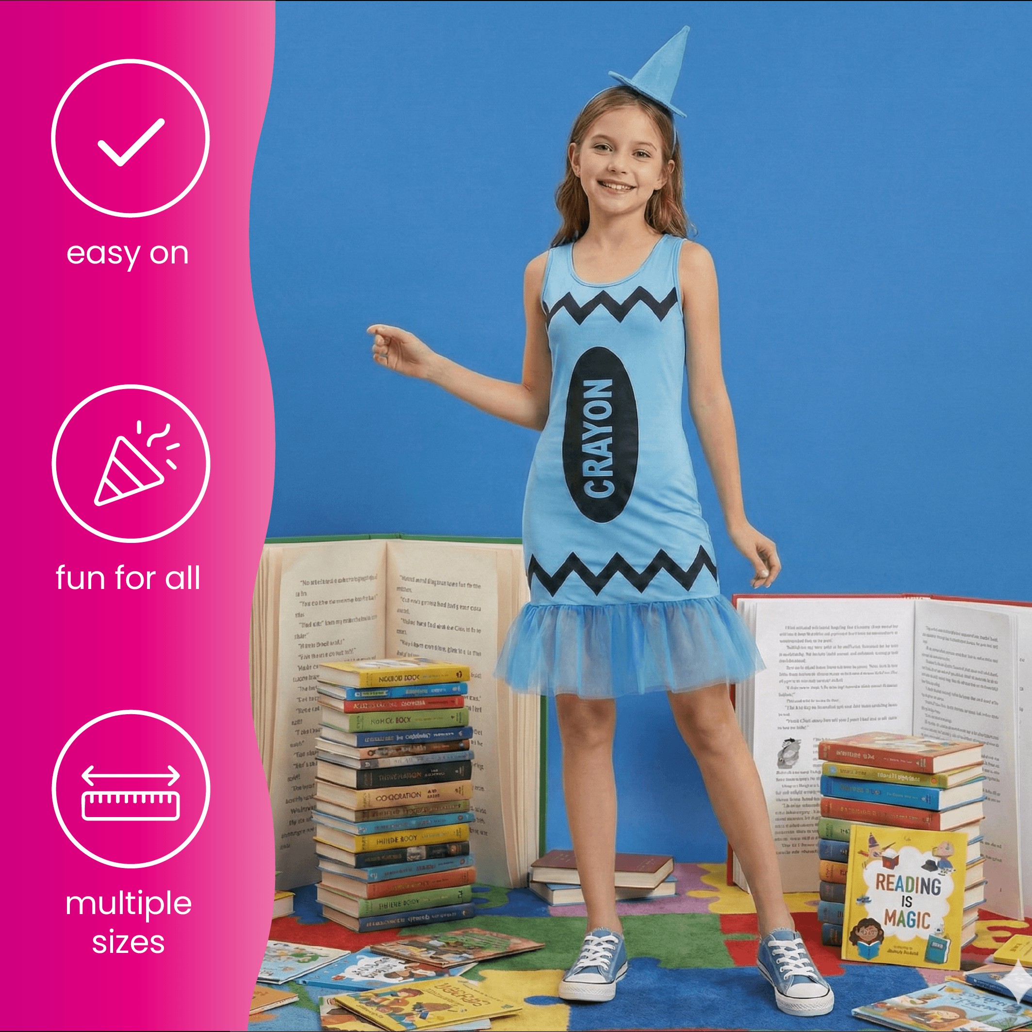 CHILD’S BLUE CRAYON DRESS: Fill in the party with colour and laughs at your next big event with your Child’s Blue Crayon Dress and scribble your dance moves into creation!