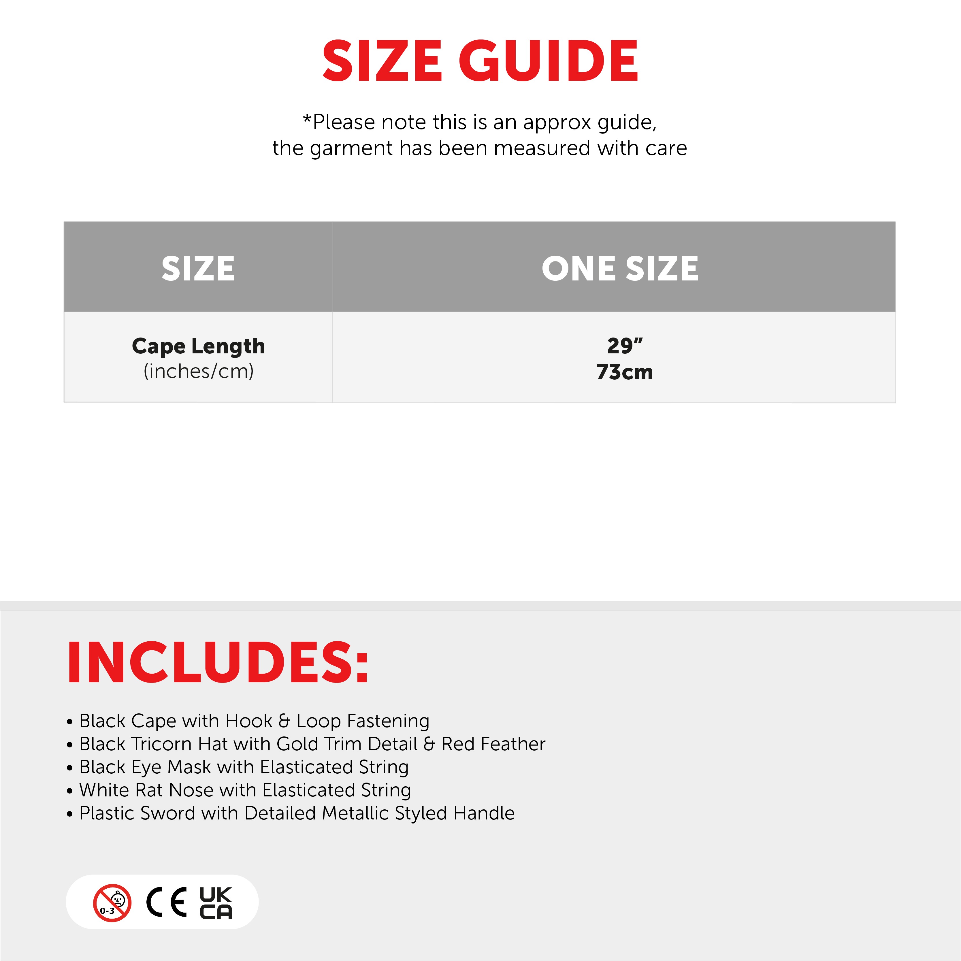 COSTUME SET INCLUDES: Your Child's Highway Rodent Costume Set includes a Silver Sword, a Black Cape, a Tricorn Hat with Gold detailing and a Red Feather, Black Eye Mask, and a Rat Nose on Elastic String!