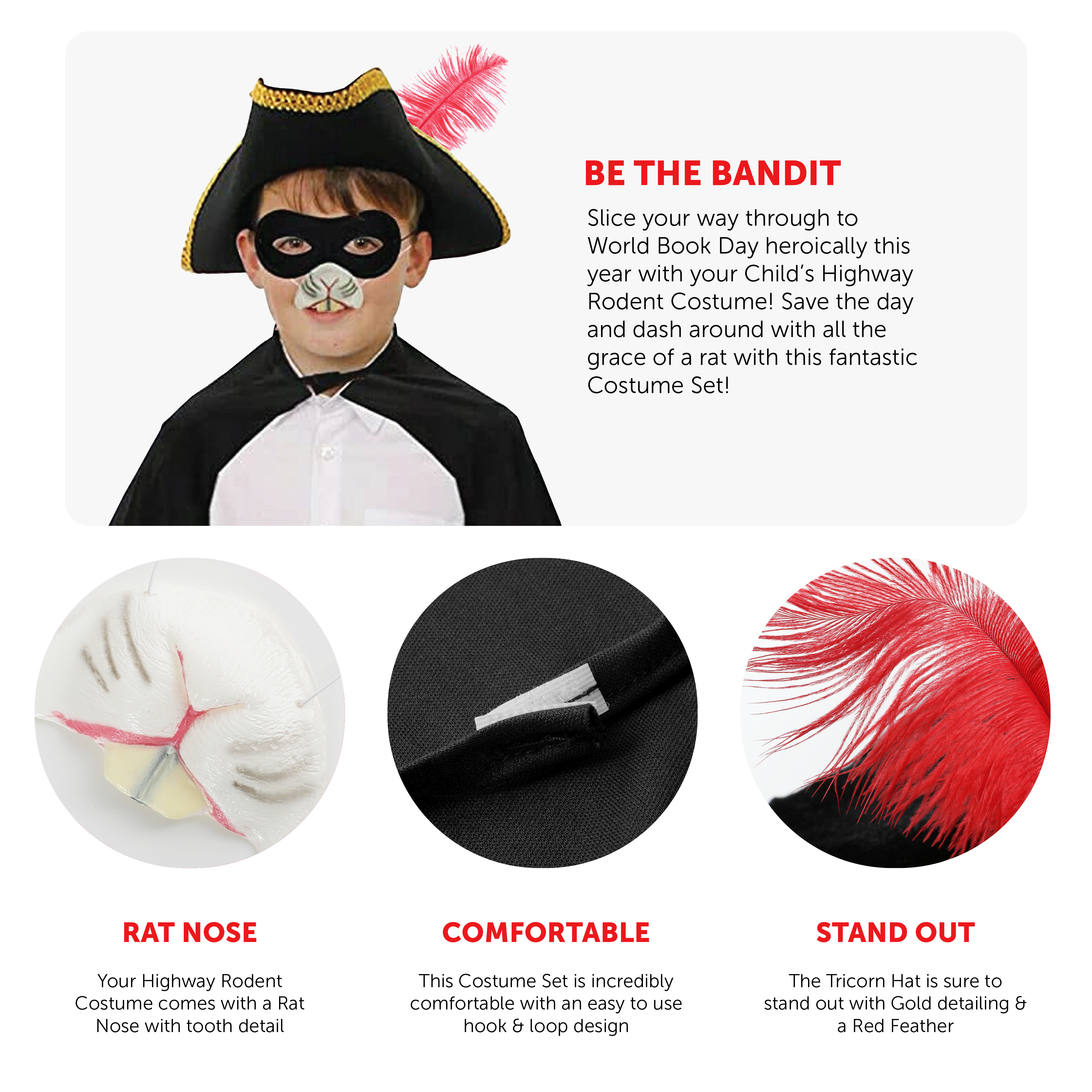 SET INCLUDES: Your Child's Highway Rodent Set includes a Tricorn Hat with Gold detailing and a Red Feather, a Black Eye Mask, a Rat Nose on Elastic String, a Black Cape, and a Palette of Face Paint!
