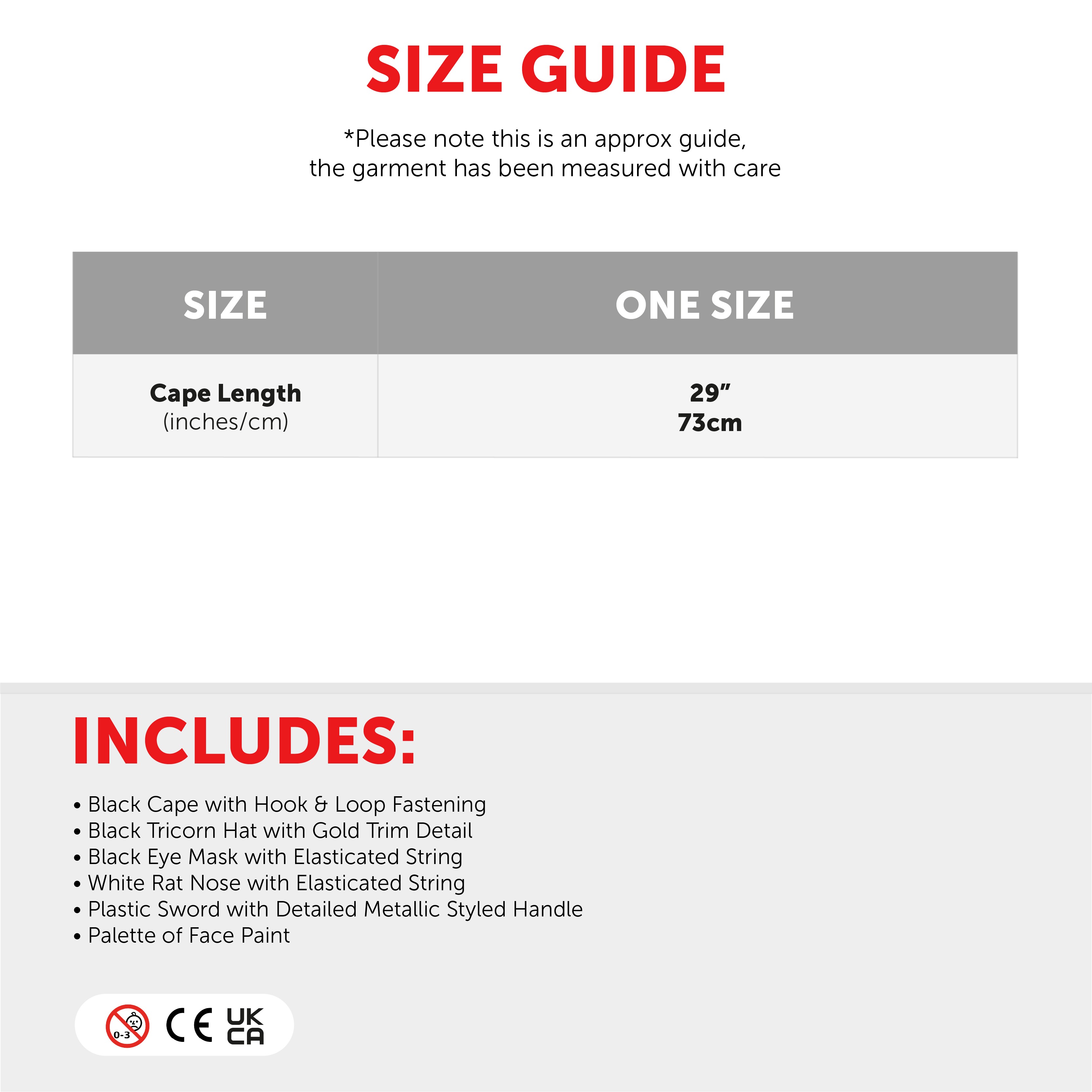 SET INCLUDES: Your Child's Highway Rodent Set includes a Tricorn Hat with Gold detailing, a Black Eye Mask, a Sword, a Rat Nose on elastic strap, a Black Cape, and a Palette of Face Paint!
