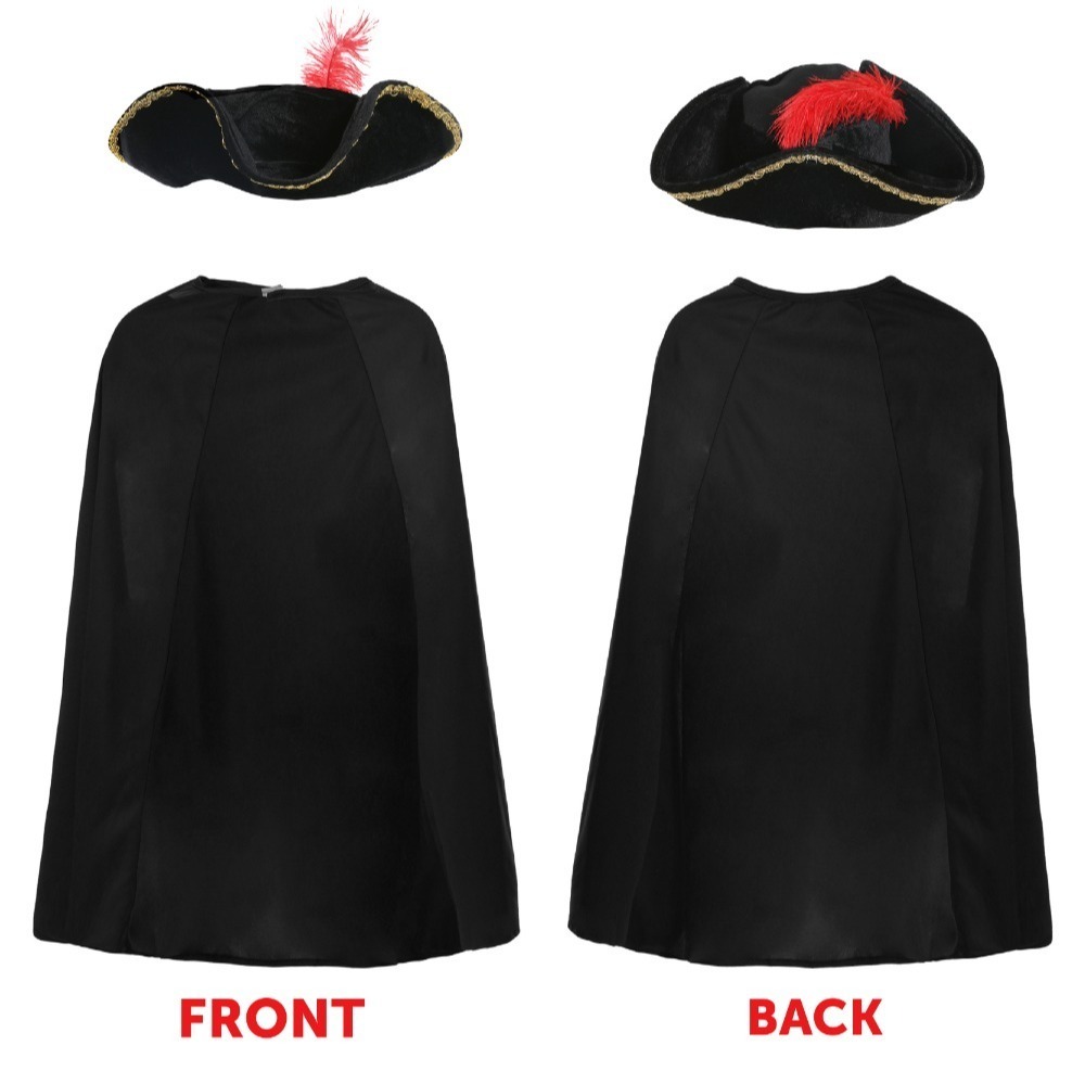 The sleek fabric cape has a strong, durable feel, while the sturdy tricorn hat is designed to hold its shape. The lightweight accessories make this costume comfortable to wear for school events and parties.