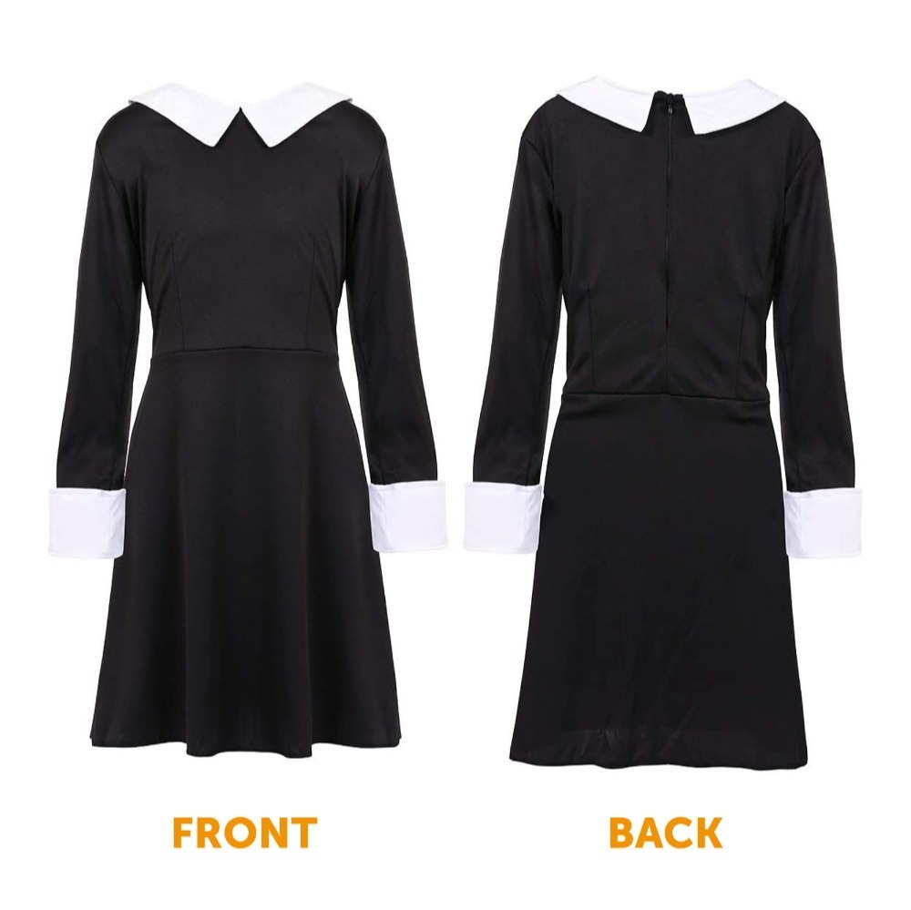 The Isadora-inspired dress features a classic black base with white accents, reflecting the character’s iconic spooky-cute look.