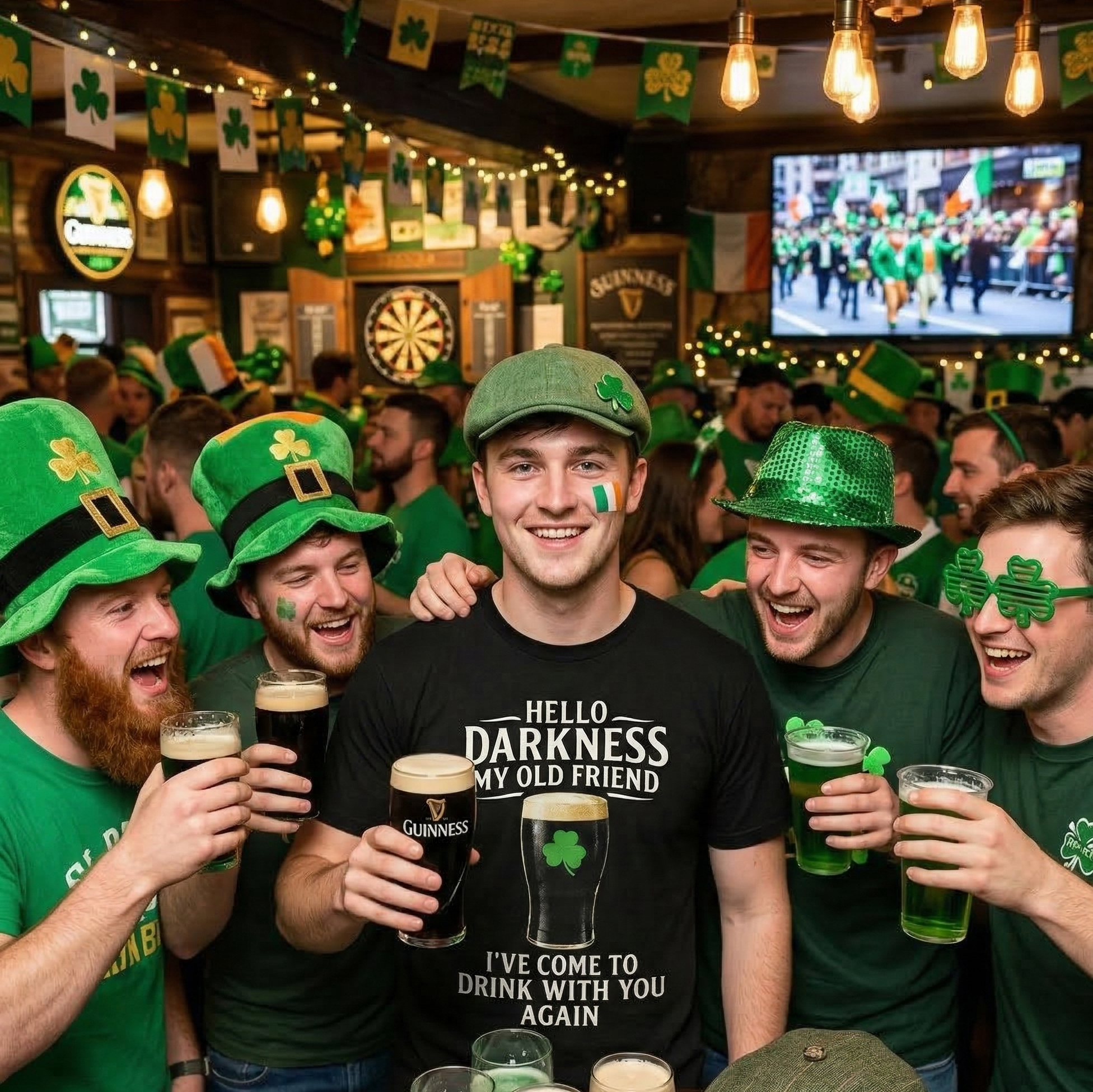 Celebrate St Patricks Day with humour and style with this fun novelty costume set. Featuring a black t-shirt with the slogan “Hello Darkness My Old Friend I've Come to Drink with You Again” printed in bold white text, along with a festive Irish green trilby hat, this outfit is perfect for pub crawls, parties, festivals, and themed celebrations.