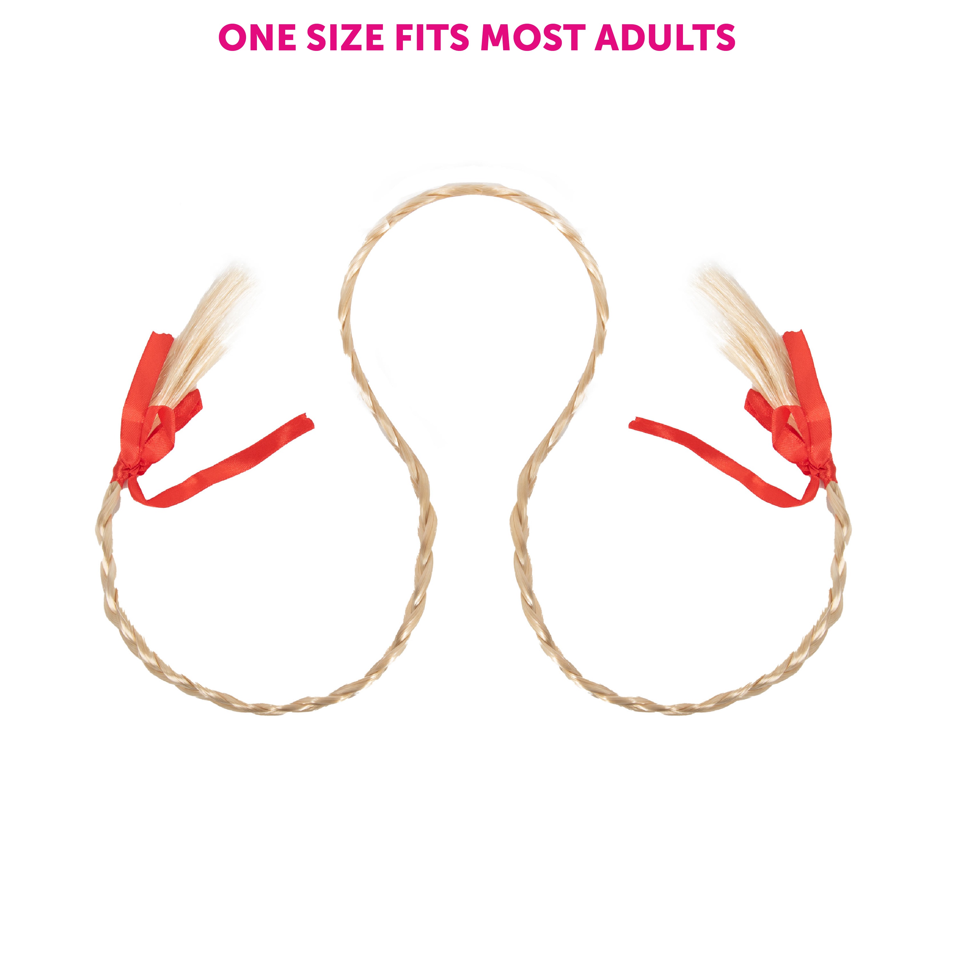 - Includes 1 x blonde plait headband with red ribbons