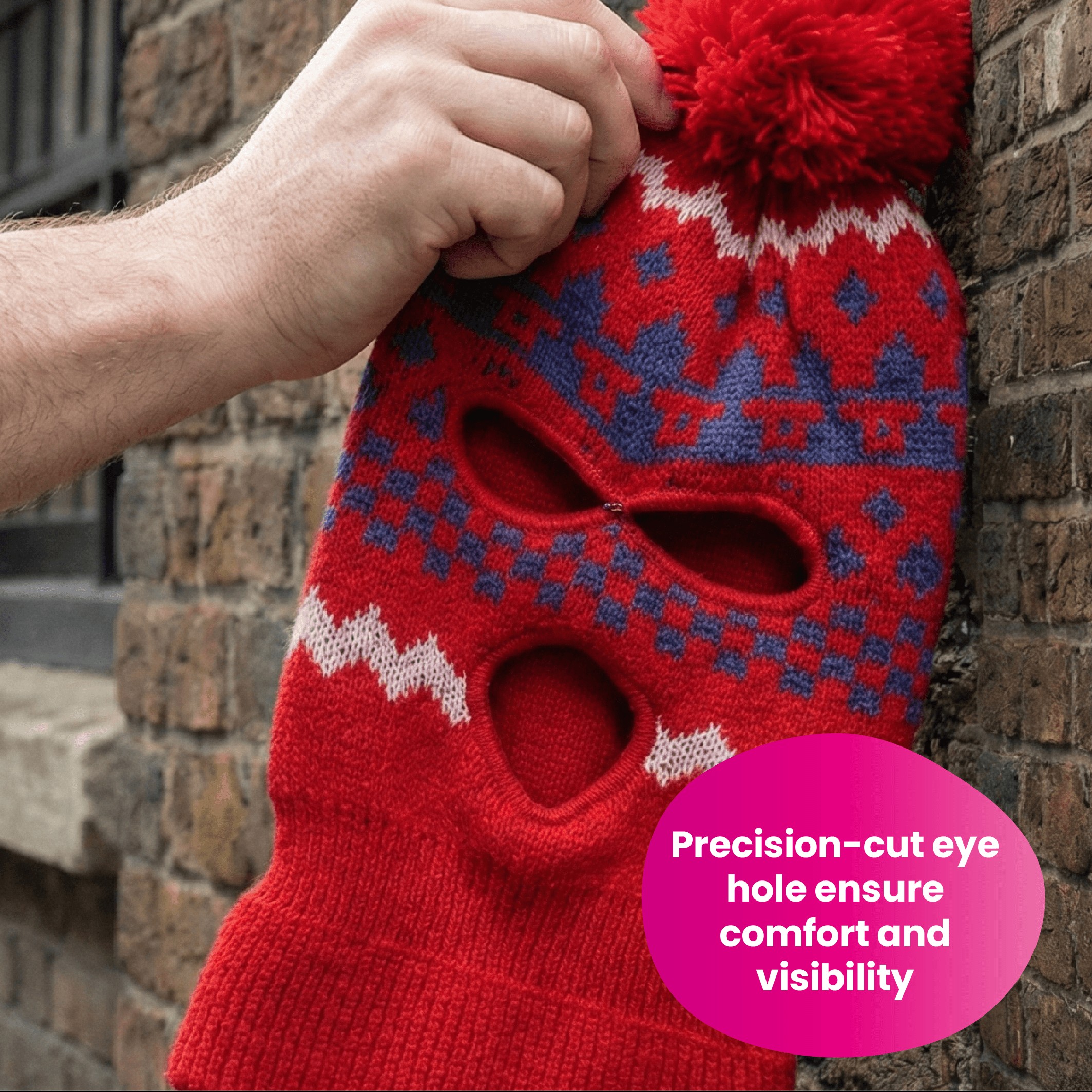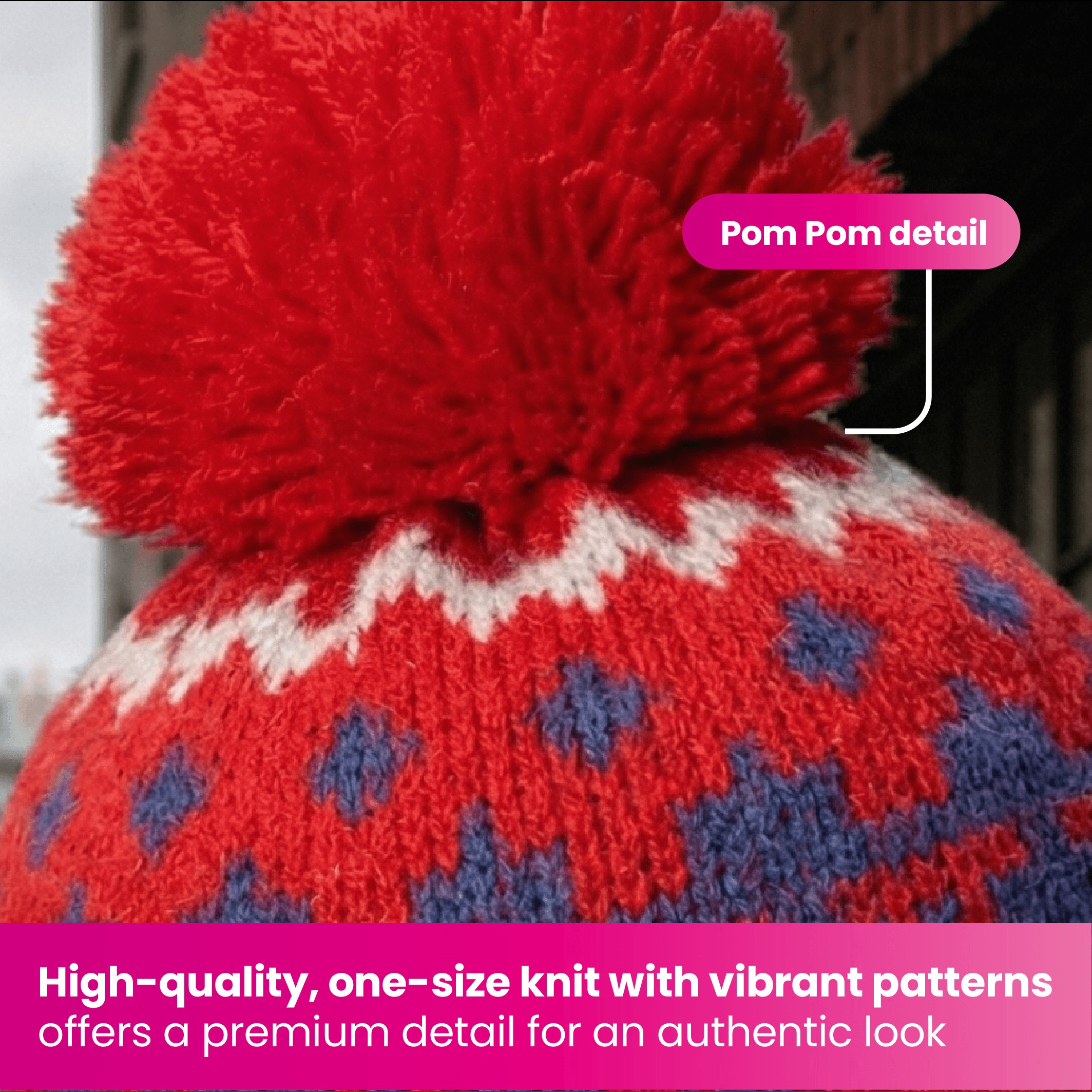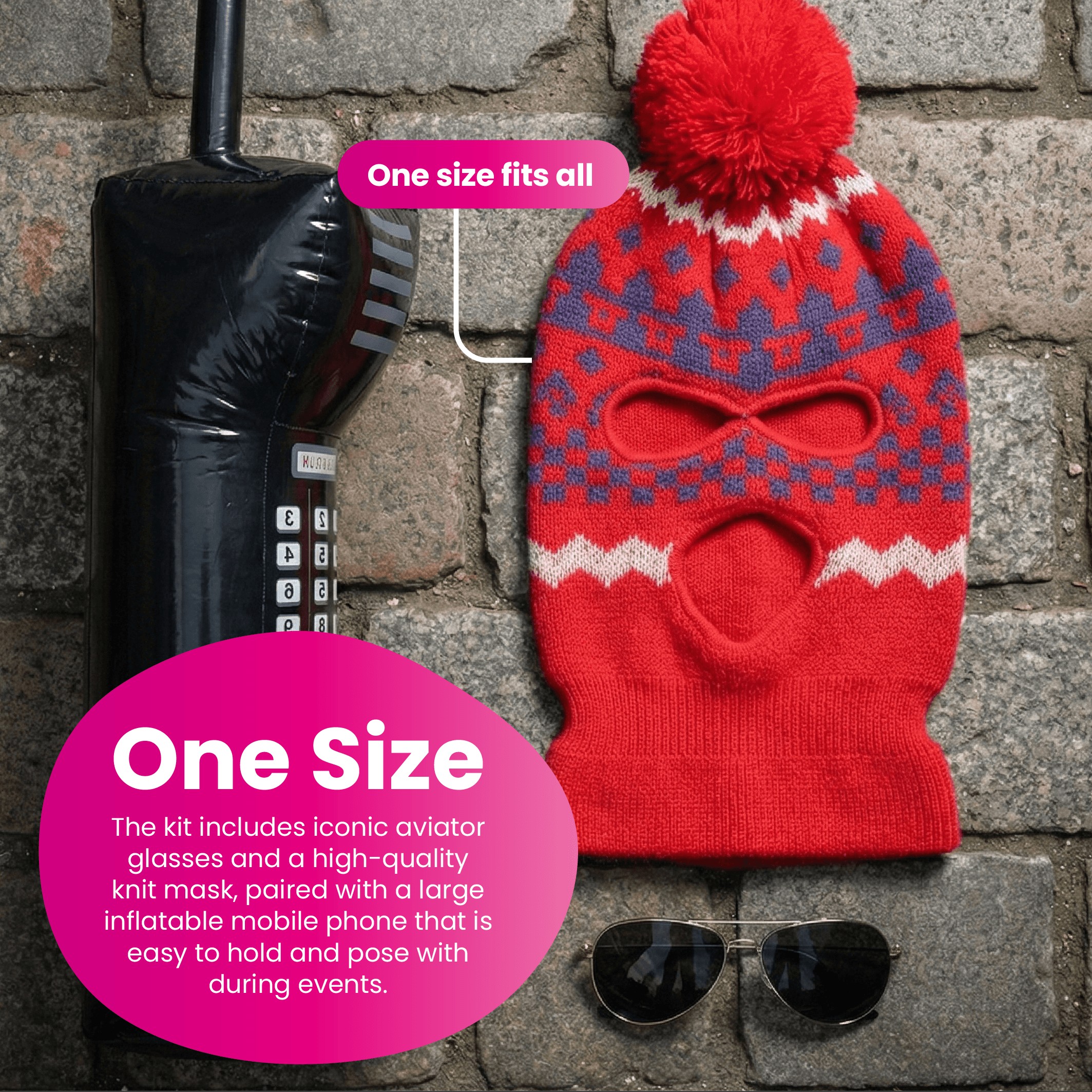 Your Phonejacker Accessory Set includes a red knitted hat featuring a blue and white pattern with a red pom pom on top, designed to pull down over the face with eye and mouth holes for that classic undercover style. The look is completed with a pair of gold frame aviator sunglasses and a retro inflatable mobile phone — because no prank is complete without the right equipment!