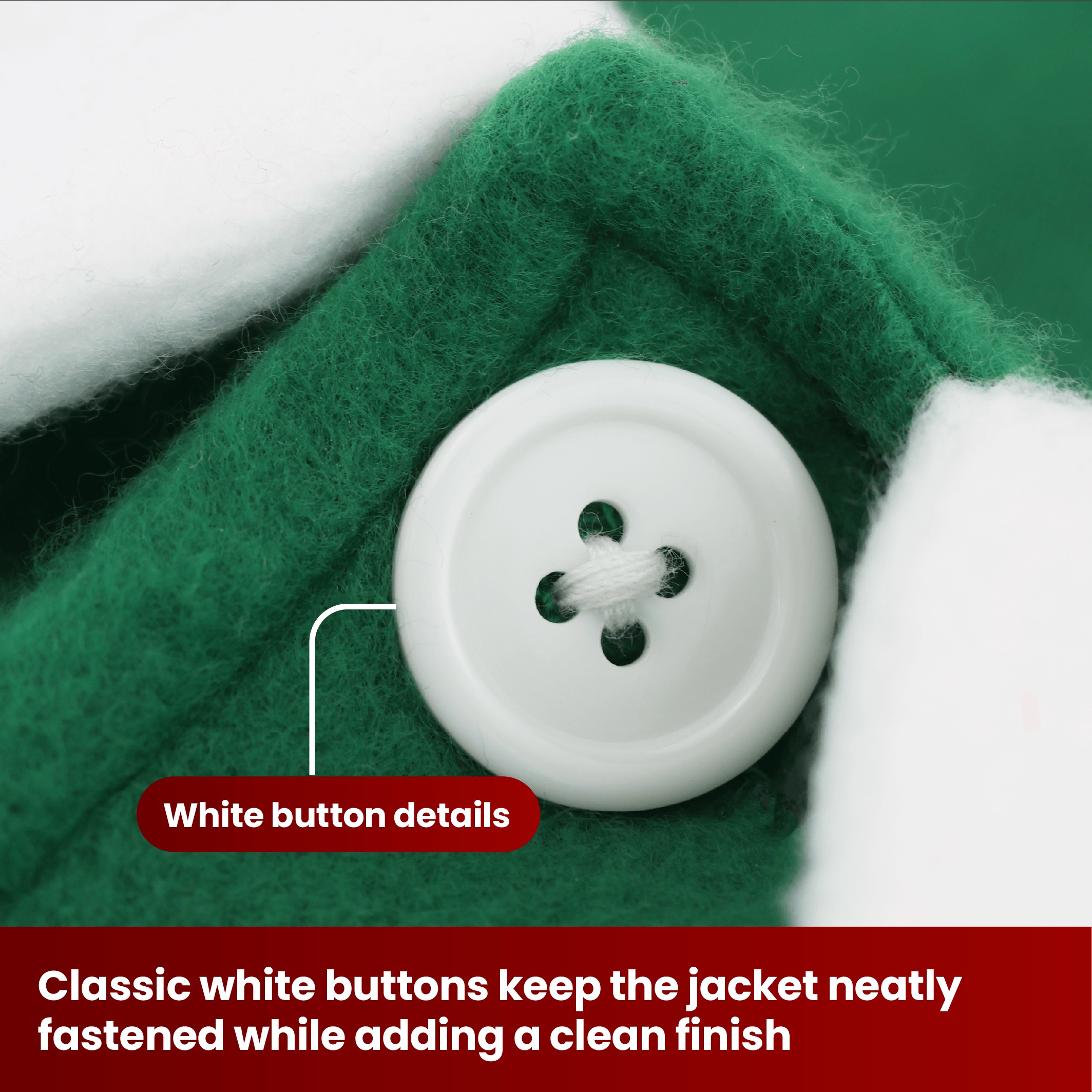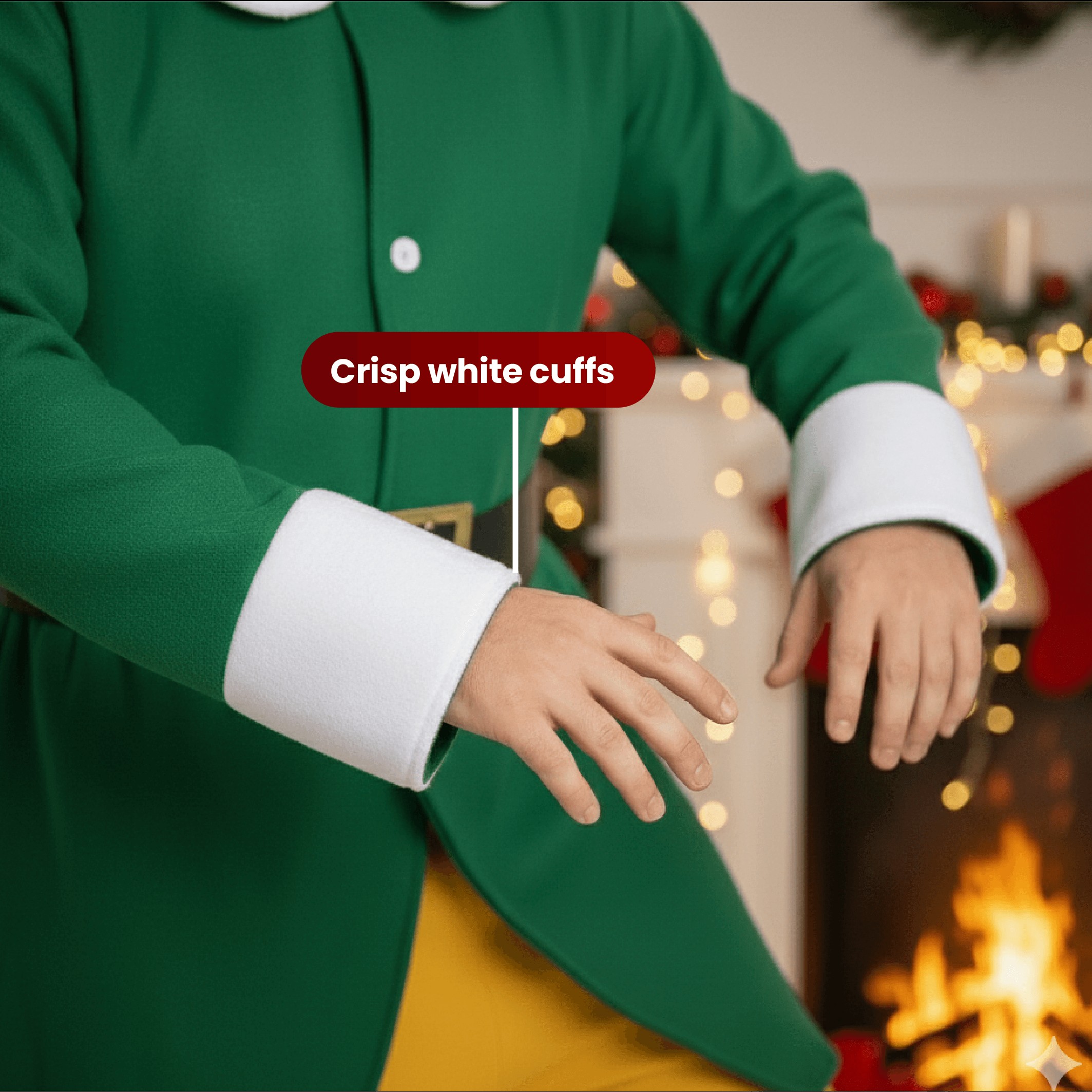 The bright green jacket features smart gold buttons, a crisp white collar, and matching cuffs for that freshly snow-dusted finish. It pairs perfectly with vibrant yellow trousers, a sturdy black belt with a bold gold buckle, and a soft green elf hat topped with a white bobble and cheerful yellow zigzag trim — ready for cookie-making, carol-singing, and spreading smiles wherever you go.