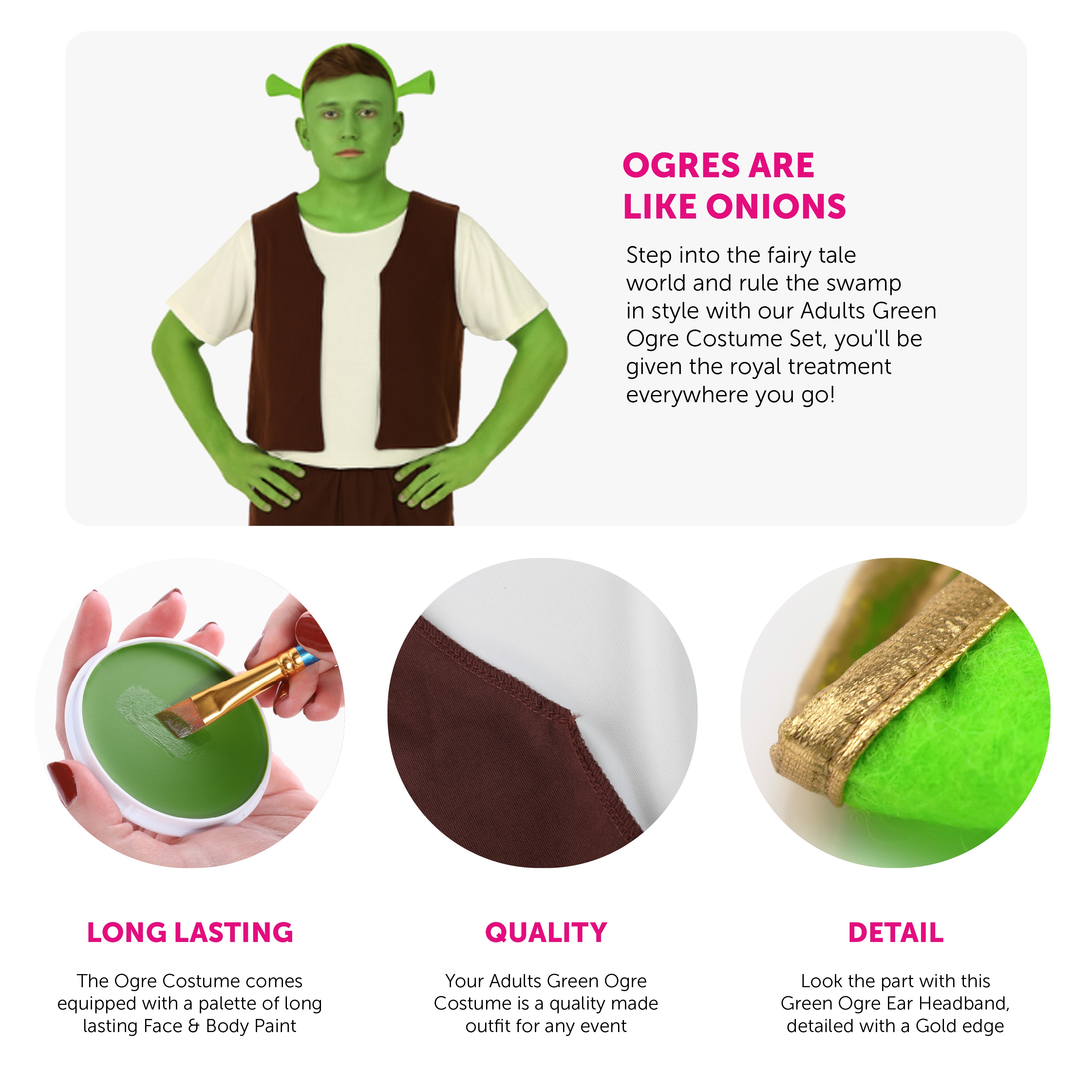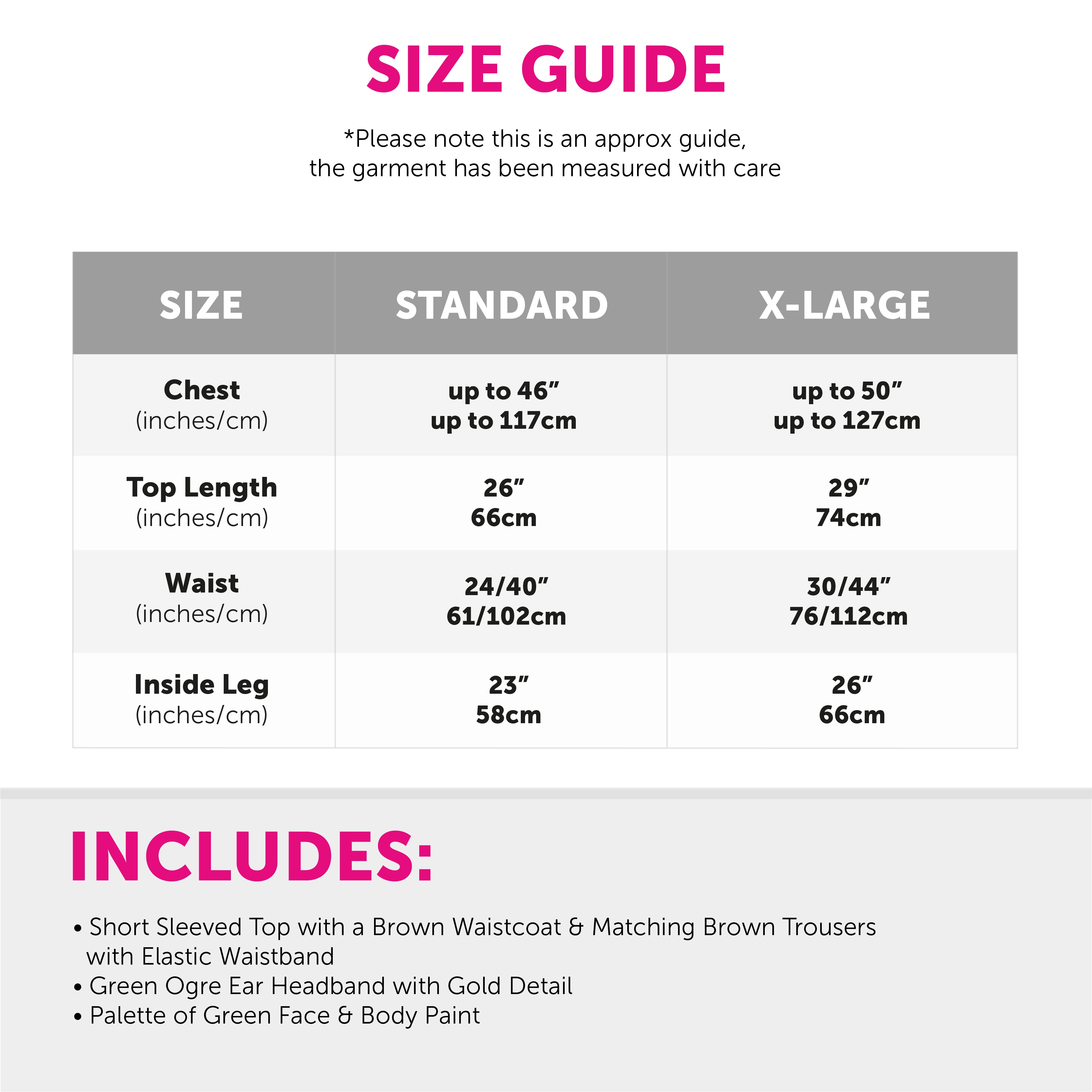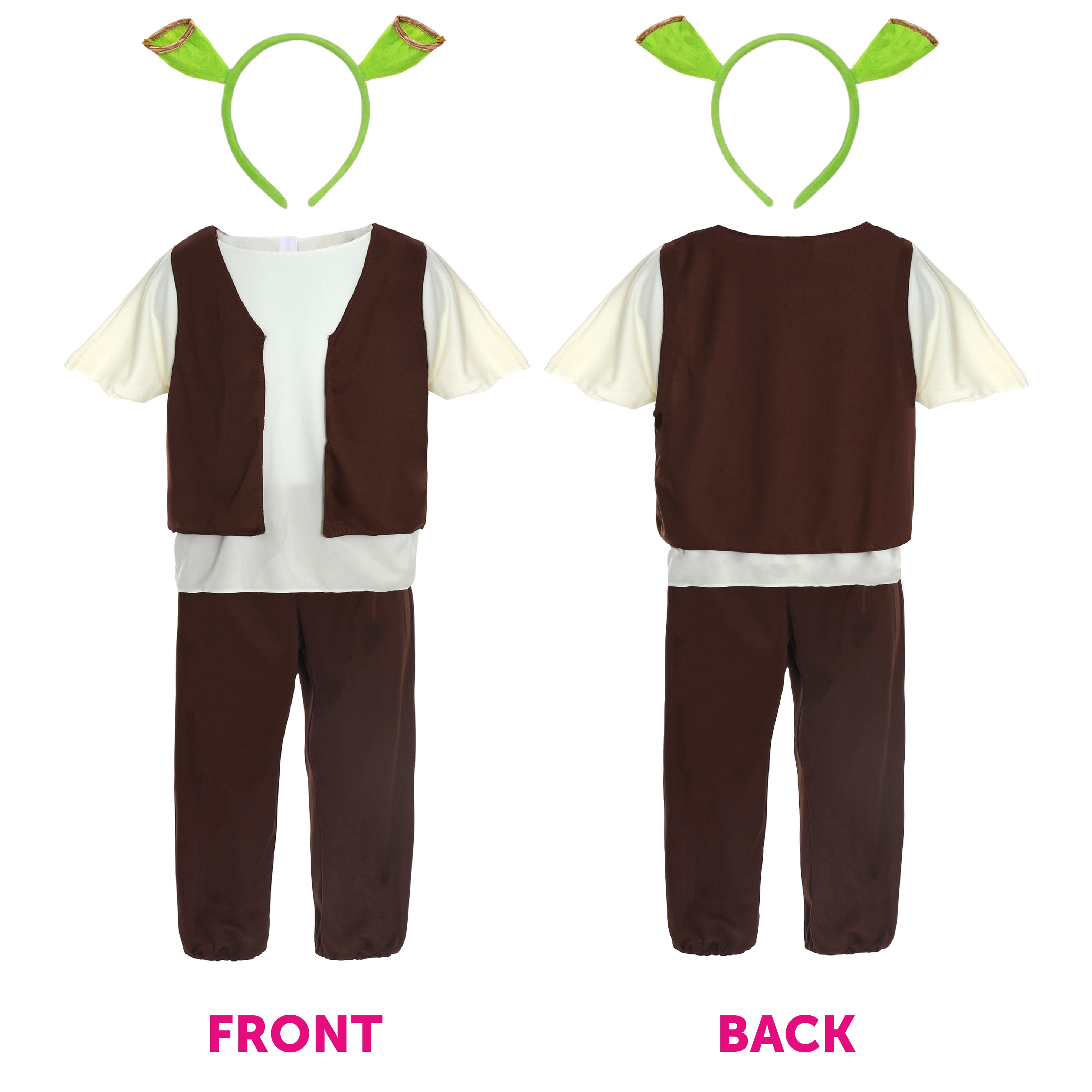 SET INCLUDES: This Adults Green Ogre Costume Set includes a Green Ogre Ear Headband, a Brown Waistcoat with a Cream Top & matching Brown Trousers, and a palette of Green Face & Body Paint, to help you finish off your desired look!