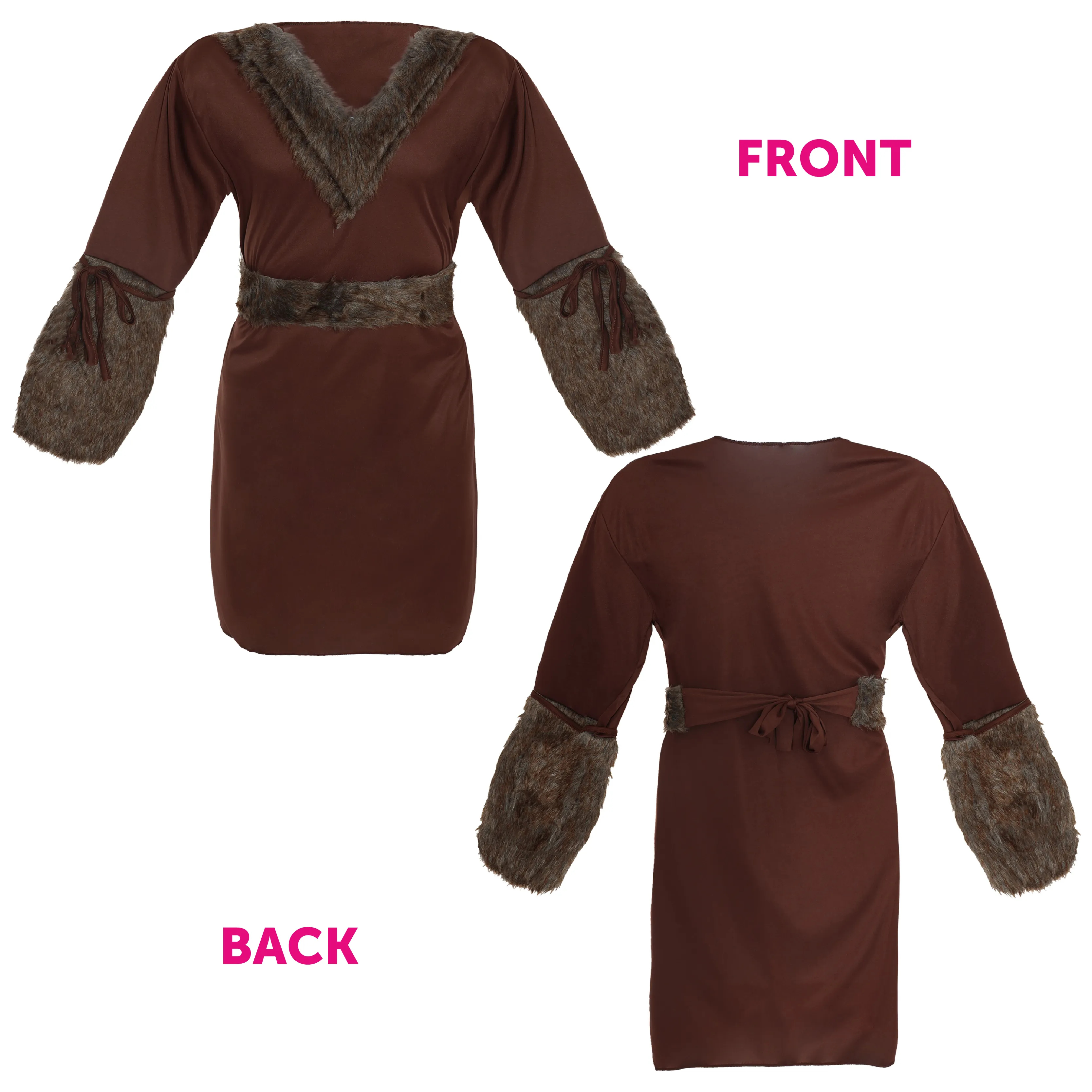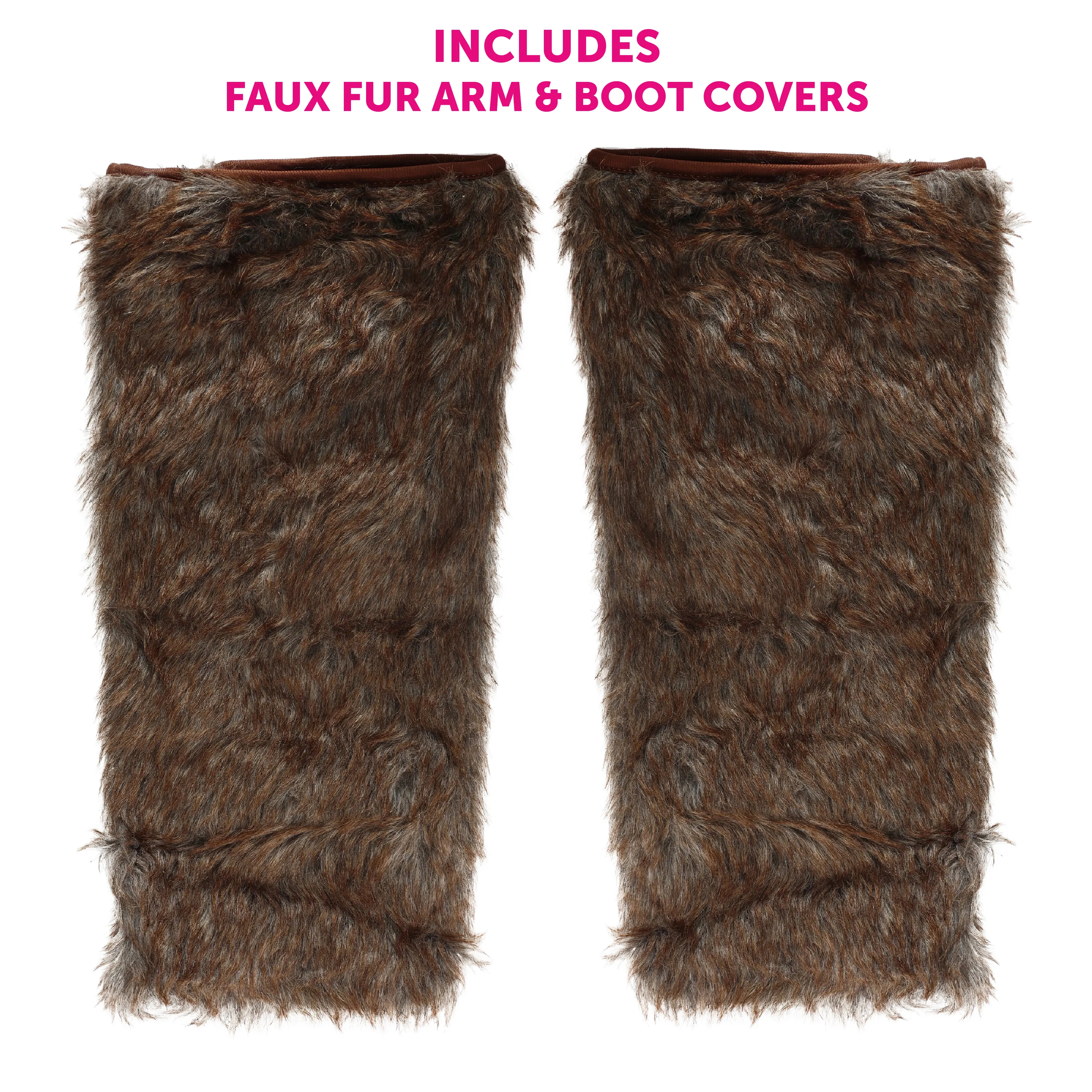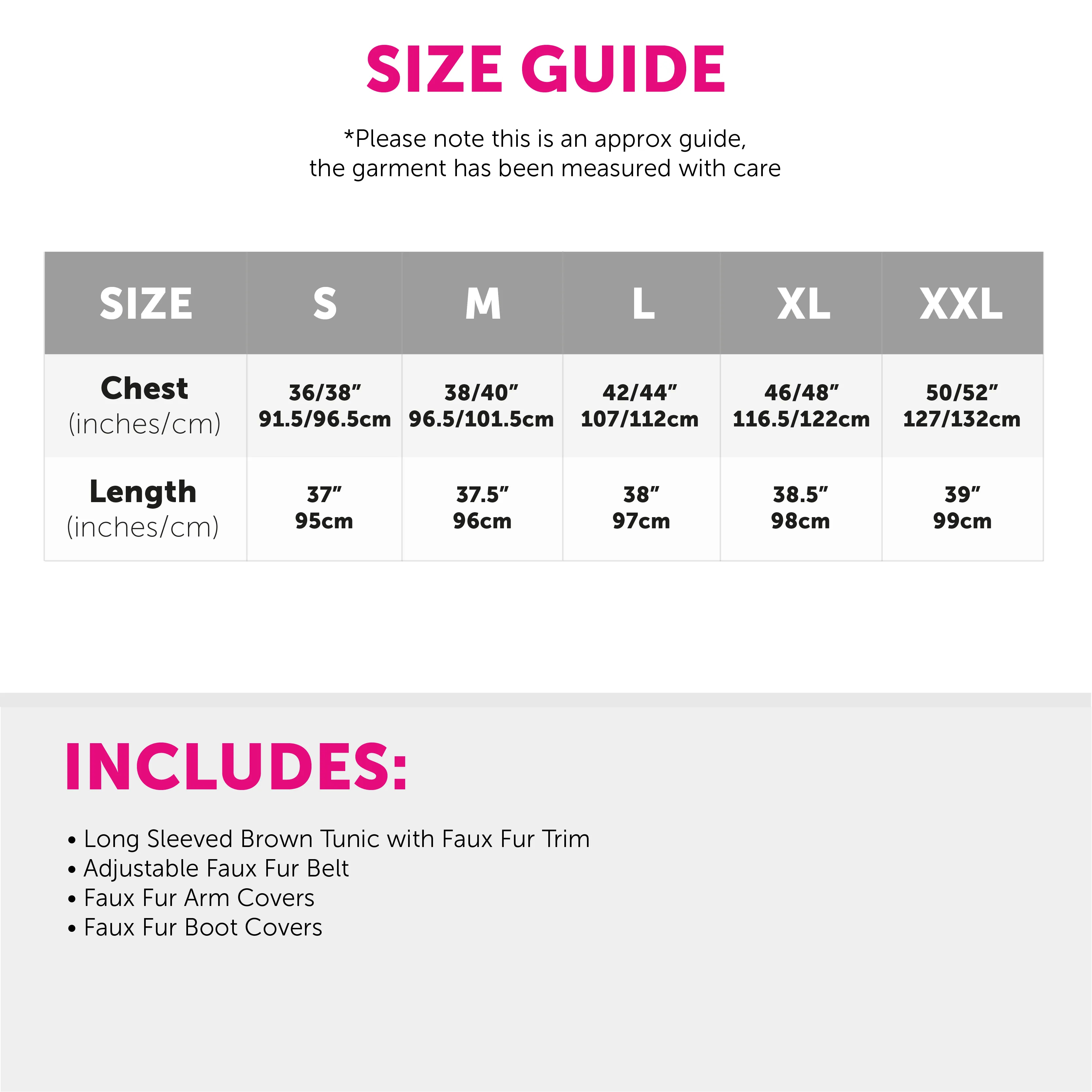 The costume features a brown tunic with faux fur trim, along with a matching faux fur belt, arm covers, and boot covers for a complete rugged tavern style. Add character with the included bald cap, plus stick-on black eyebrows and tash to finish the look.