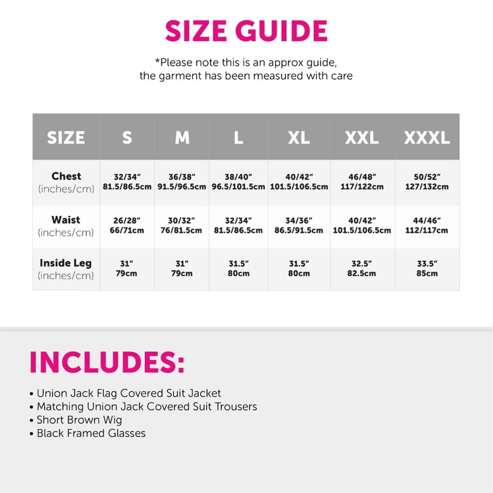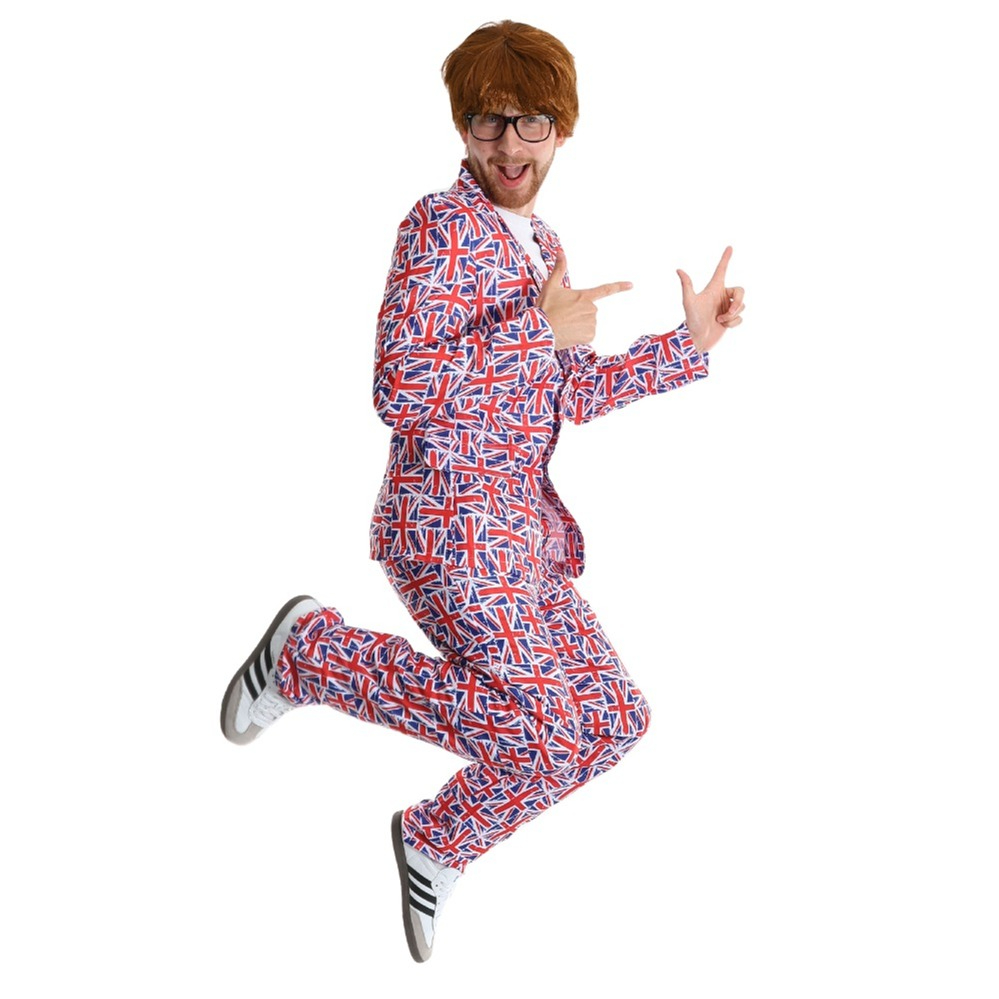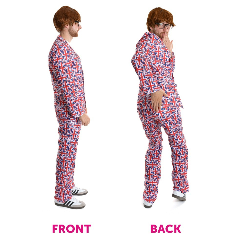 COSTUME SET INCLUDES: This Adults Groovy Spy Costume Set includes a Short Brown Wig, Glasses with a Thick Black Frame and a Two Piece Union Jack covered Suit with a Jacket and Trousers, the perfect outfit for your next fancy dress event!
