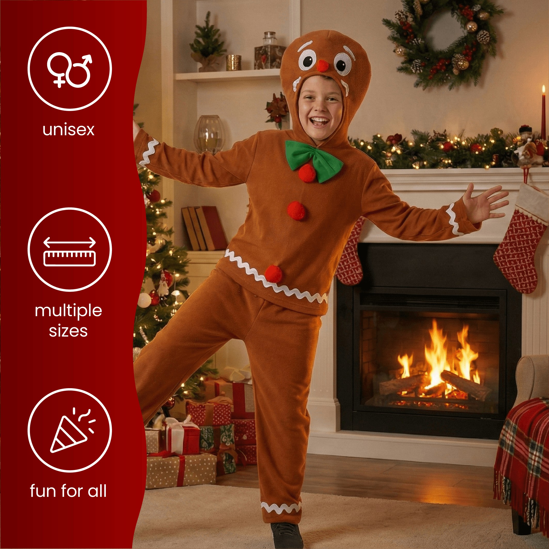 Your Boys Gingerbread Man Costume includes a brown hooded jumper featuring a smiling gingerbread face, colourful button detailing, and white icing-style trim for that freshly baked look. It also comes with matching brown trousers, creating a full festive outfit that’s comfortable, easy to wear, and perfect for all kinds of Christmas fun.