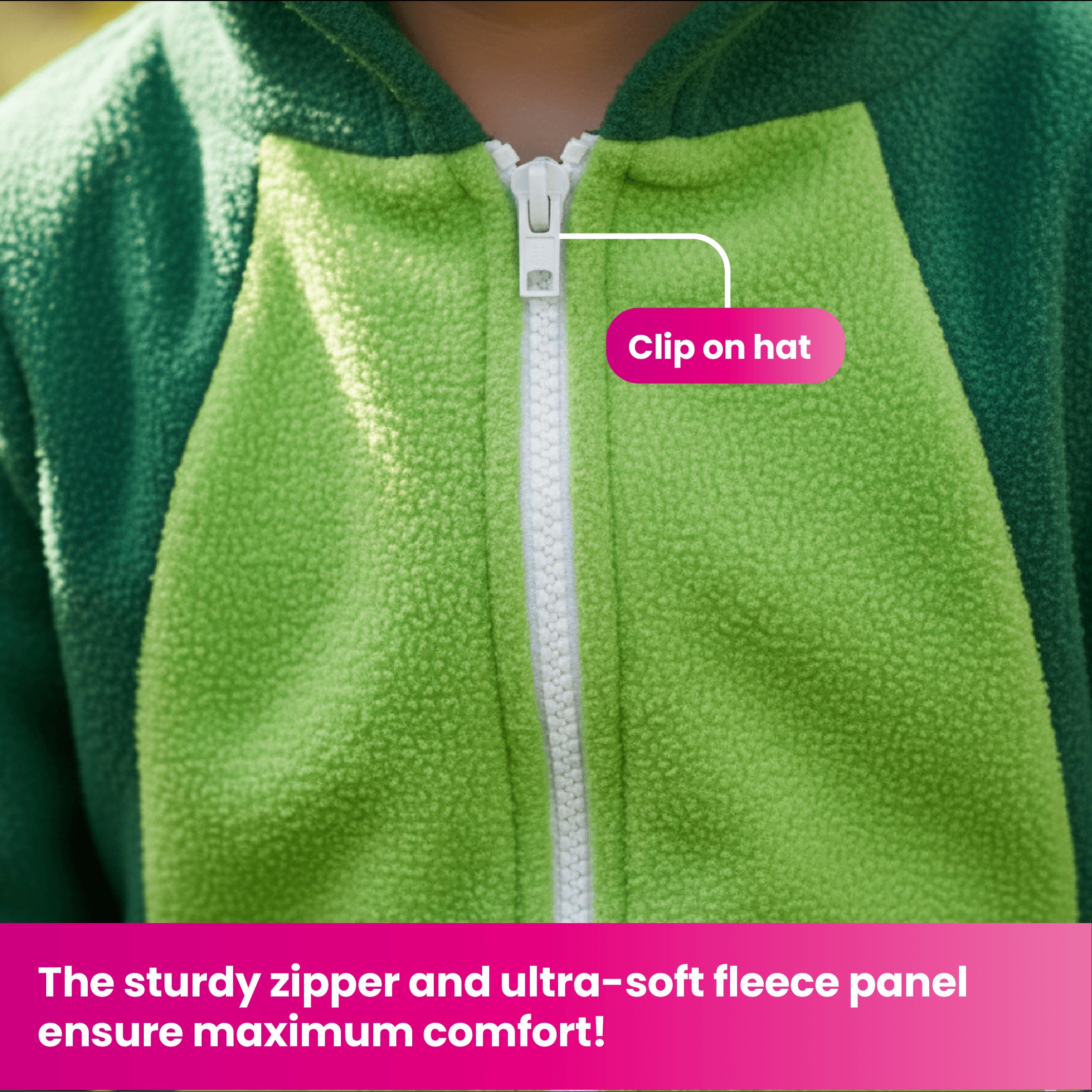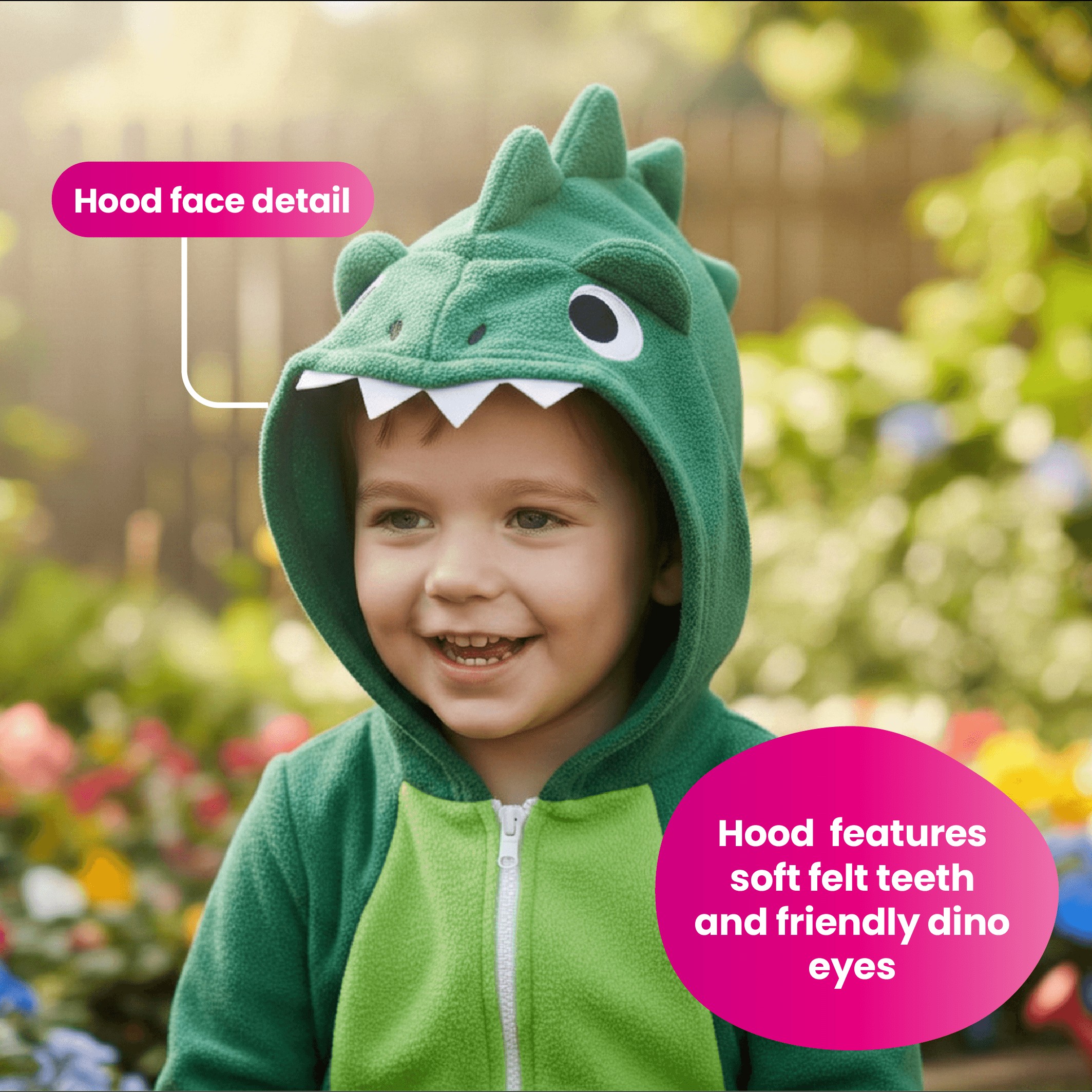 Whether roaring like a friendly dinosaur or enjoying cosy dress-up fun, this Boys Green Dinosaur Onesie is a fun and comfortable costume he will enjoy wearing again and again.